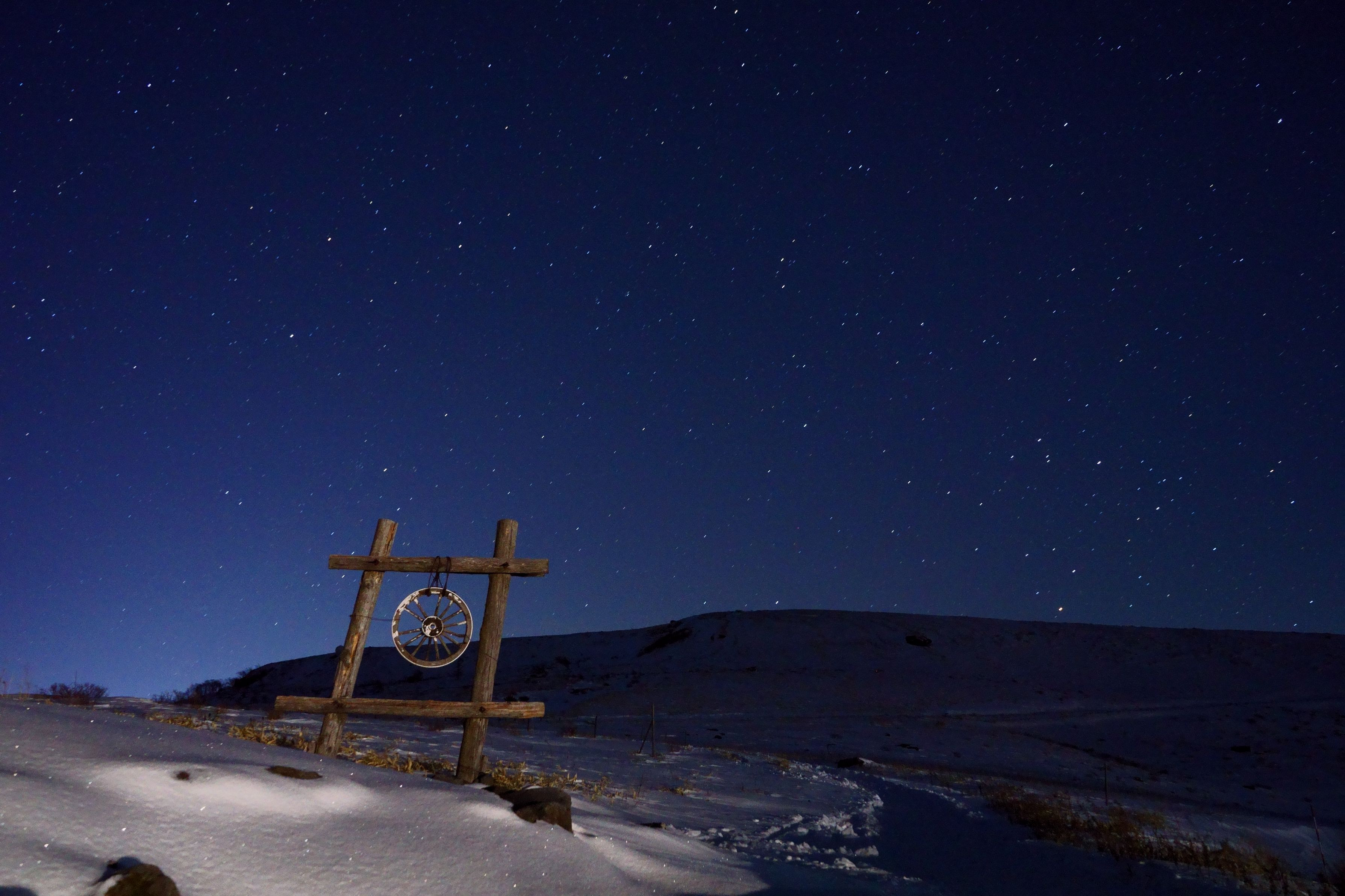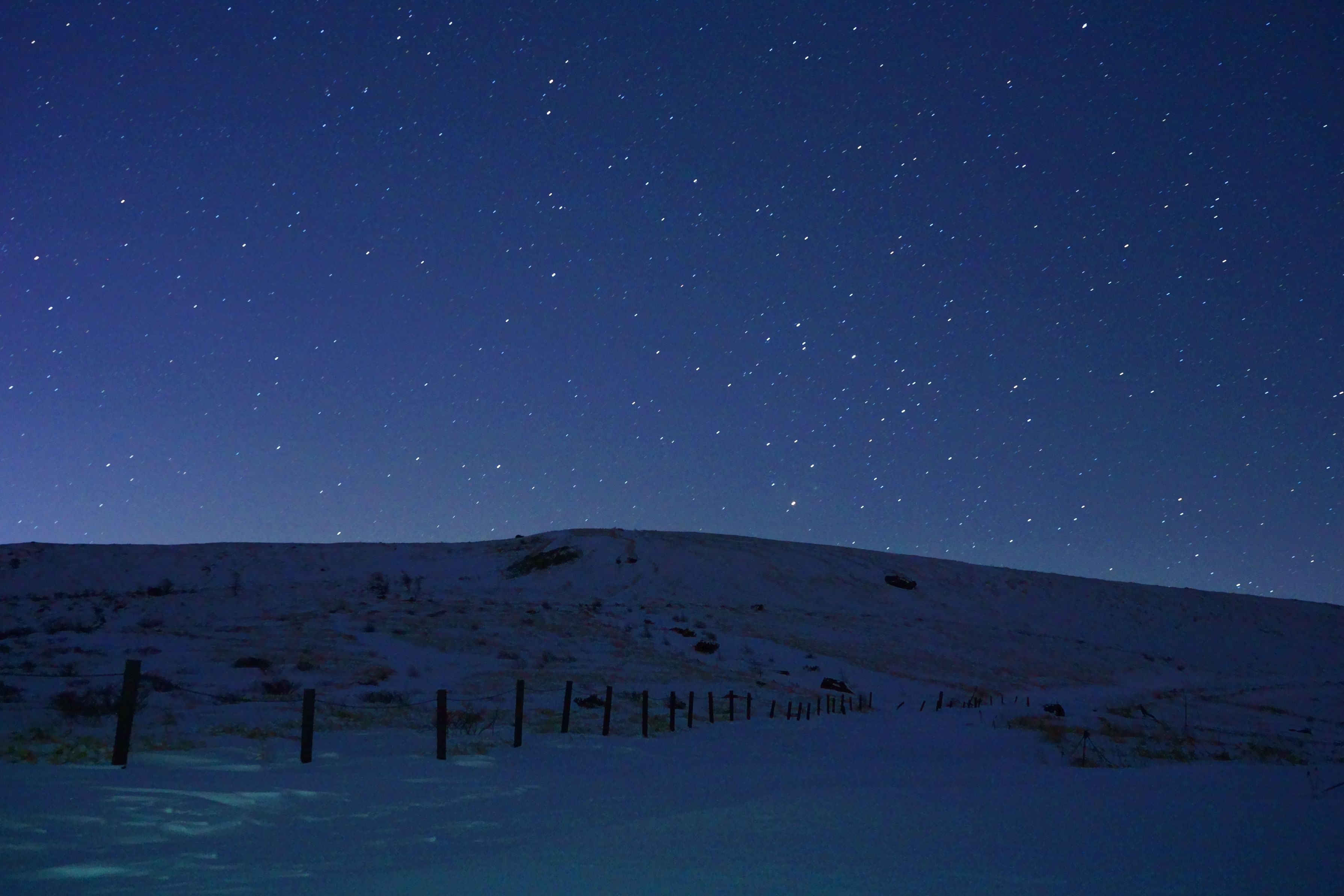 初心者ながら星景写真に挑戦してみました。 帰ってからもっとiso上げて何枚も撮って合成すればよかったと後悔 気温ー10度でひざ下までの積雪があったため、チェーンアイゼンでは心許ないと思い山頂からは撮影せず