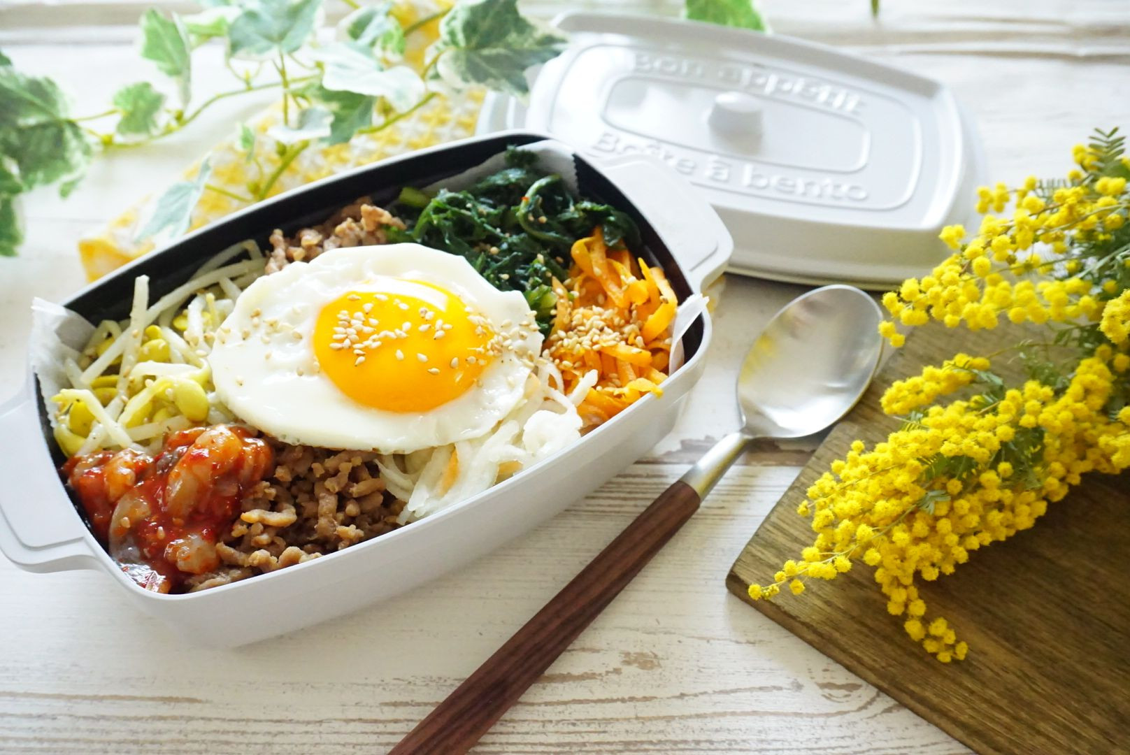 ビビンバ弁当! 菊菜のコチュジャンナムル豆もやしナムル 人参ナムル 大根なます 肉そぼろ イカキムチ 半熟目玉焼き コチュジャンが無くなったからイカキムチ😅 ピリッとが無いと物足りないもんね💦