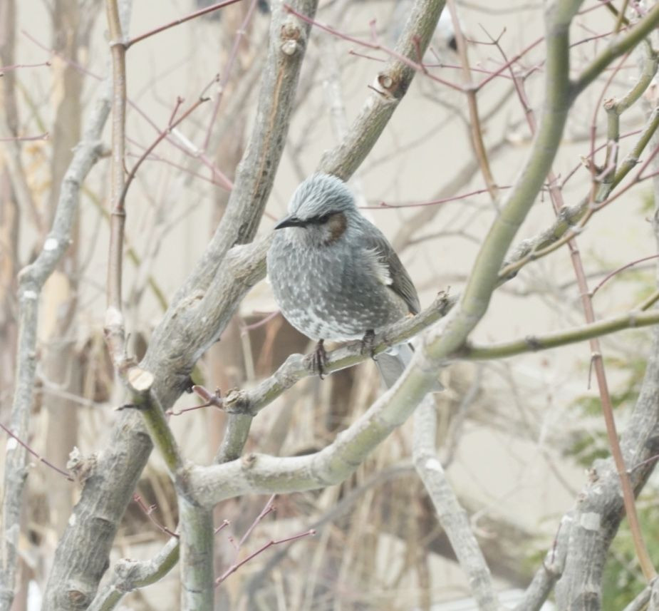 室内から窓越しで撮影。我が家の庭に来るヒヨドリです。