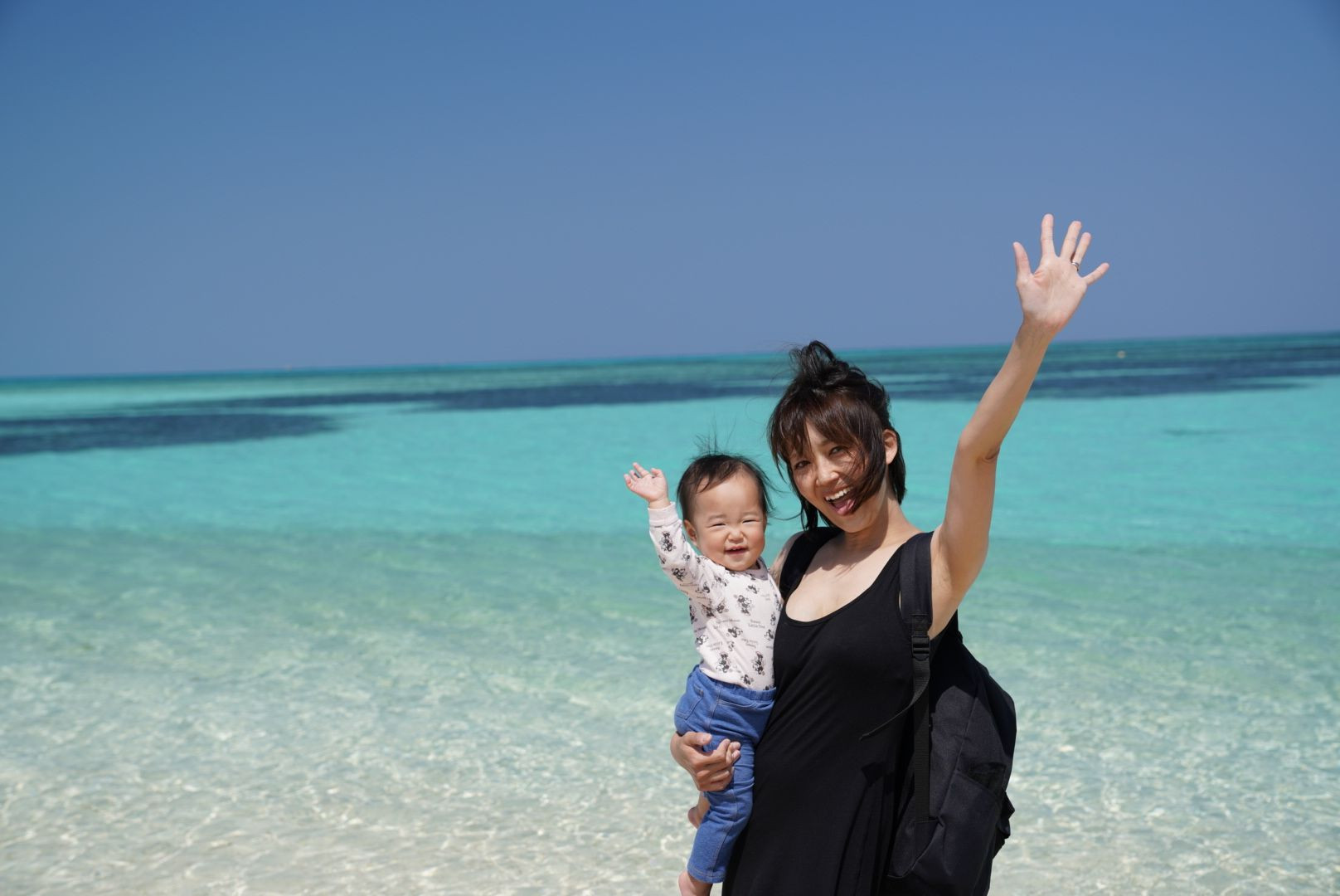 南の島へ家族で出かけました! 海を背に妻と娘が、はーい!