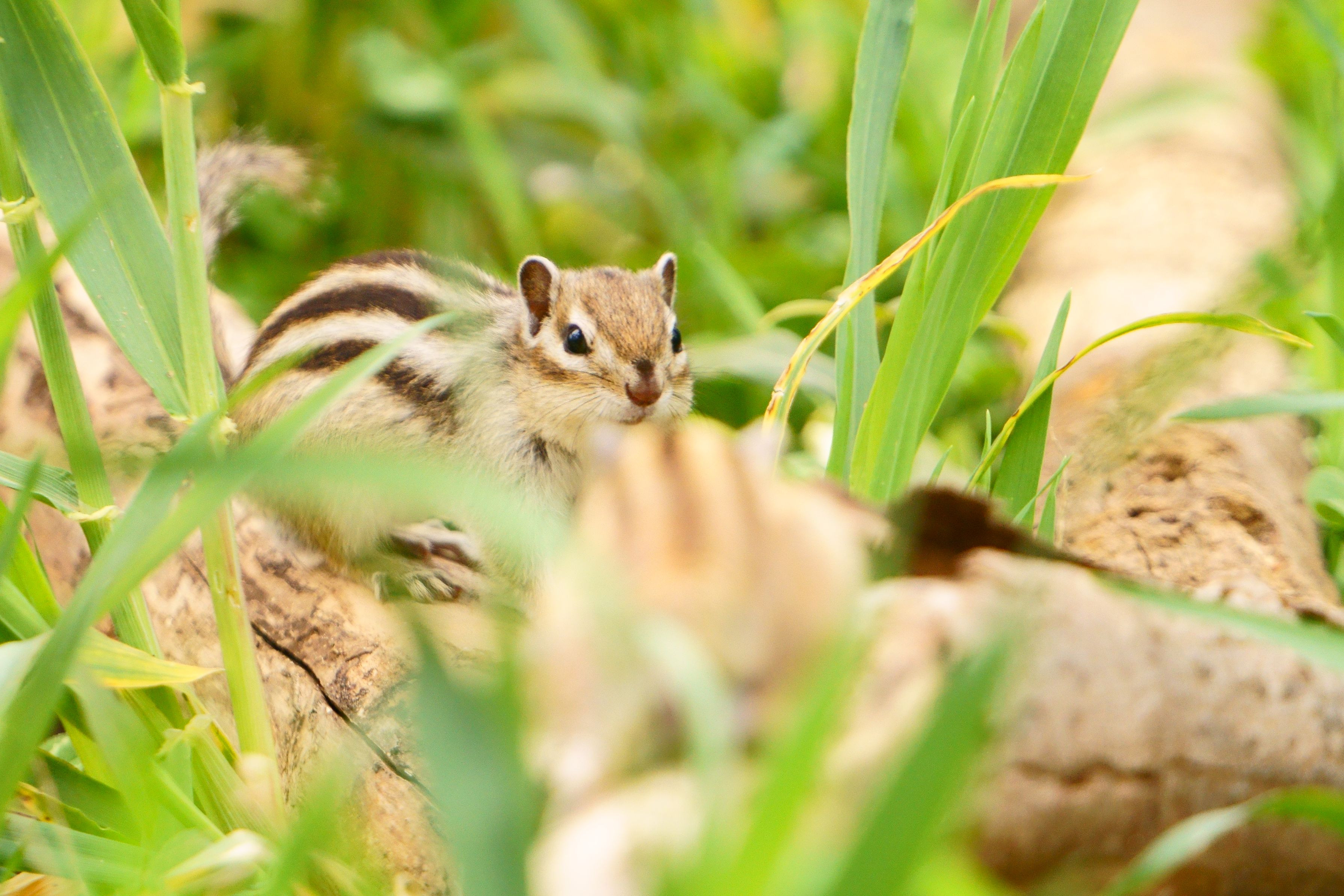 春のこの時期のシマリスは子作りの季節。メスは誘ってオスは追いかけまくる1日を過ごしています。この日はたくさんのシマリスが駆け回っていました。この写真はオスとの出会いの瞬間なんですが。。。この後、全力で逃げ回っていました。