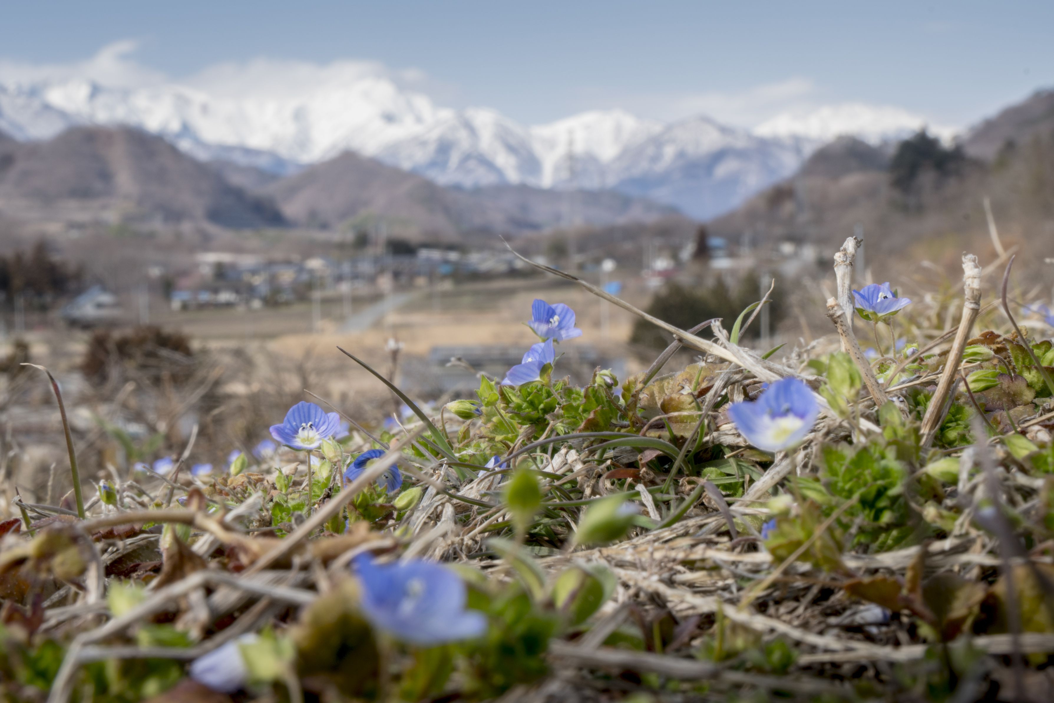 赤城高原に咲くおおいぬのふぐり(雑草)。 遠くに見えるのは谷川岳。