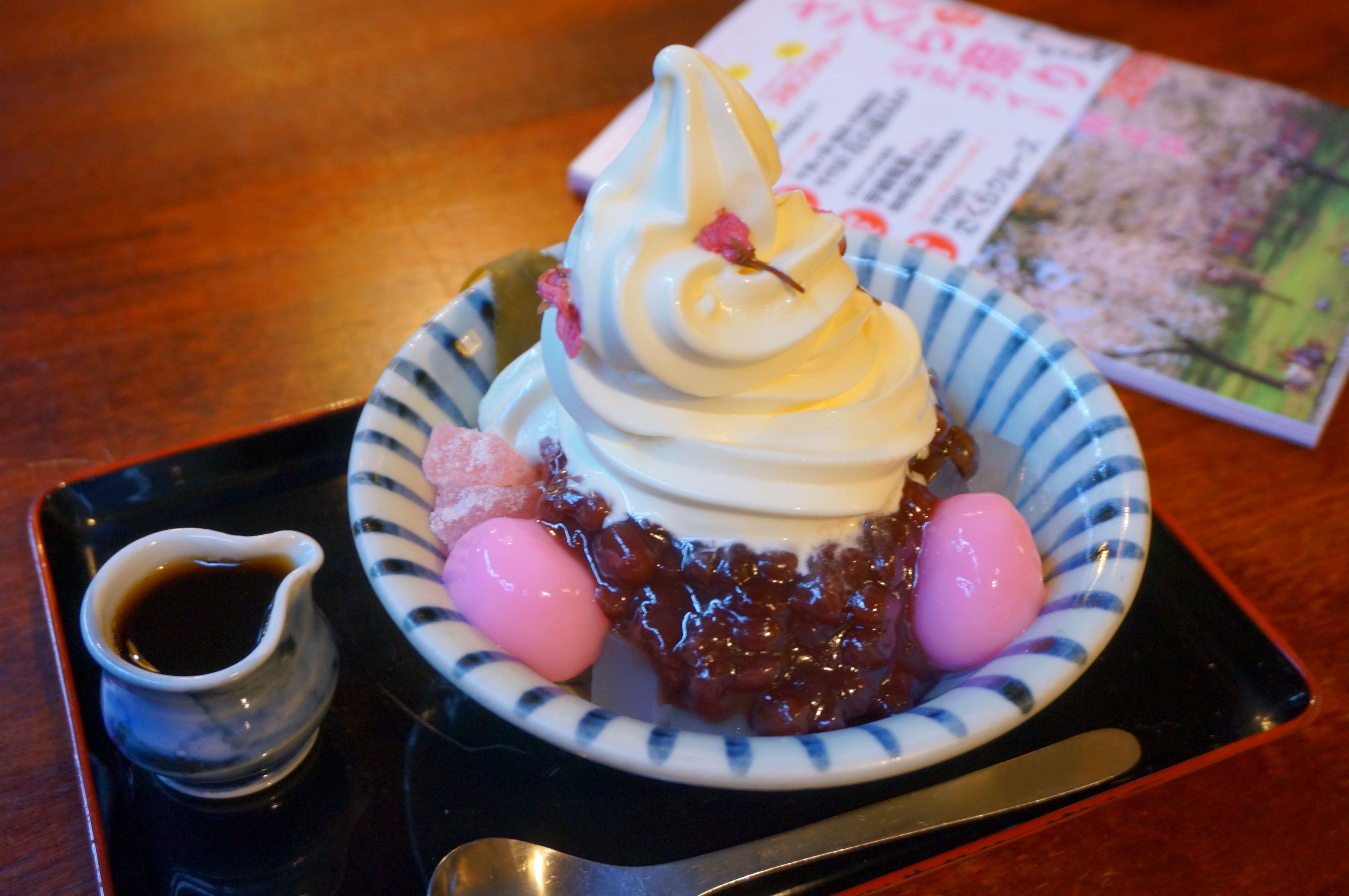 国立劇場の神代曙という可愛らしい桜を見たあとは、甘味処の老舗 おかめの桜あんみつ〜♪