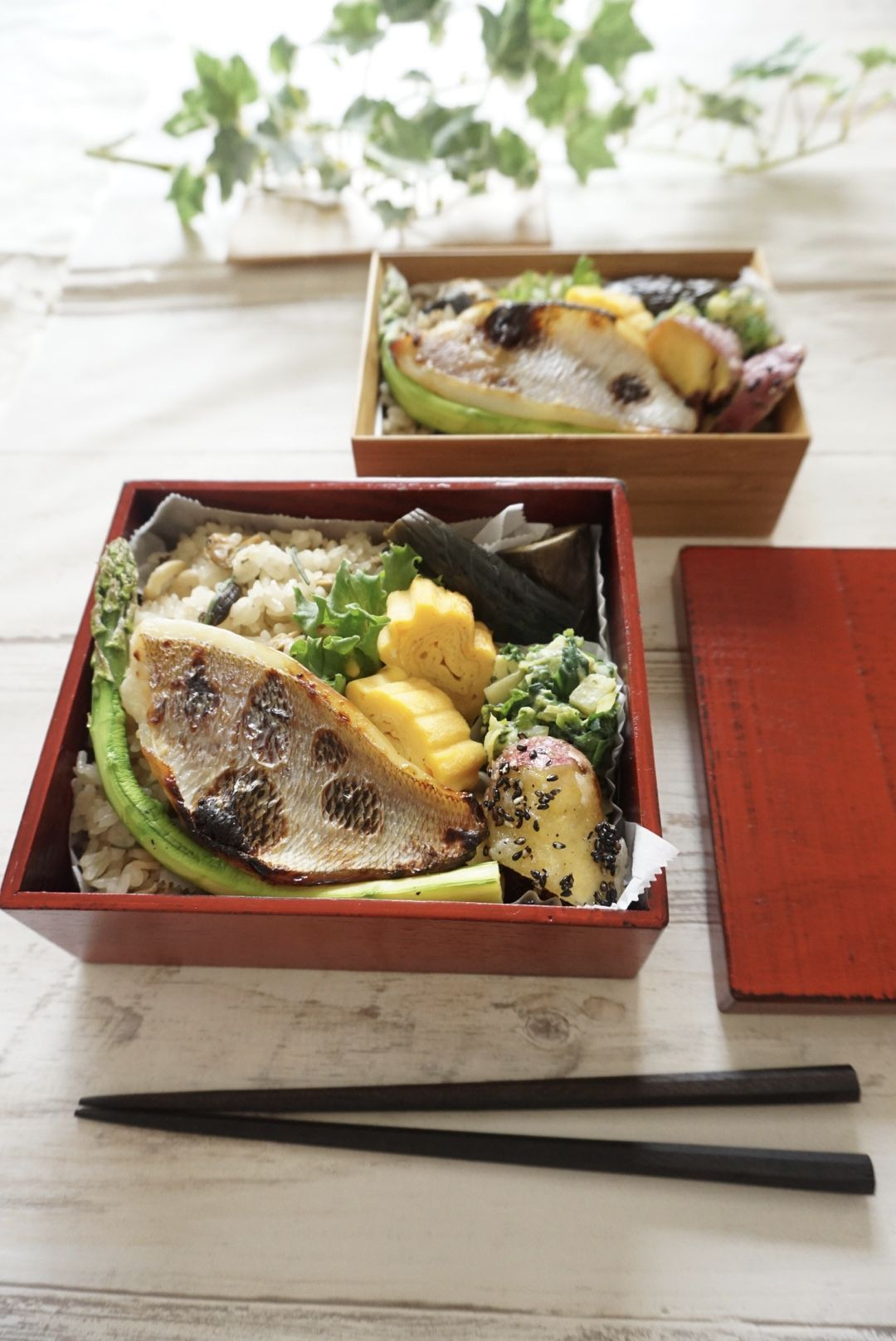 あさりご飯 茄子煮 筍の木の芽和え 出し巻きたまご焼き 鯛の塩麹焼き焼きアスパラガス 桜は、まだ咲かないけど筍がスーパーに出だしたよ〜 春の食材でお弁当
