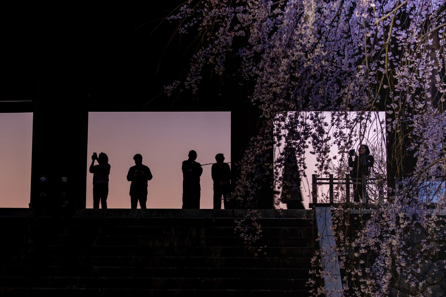 府中市にある東郷寺の枝垂れ桜が満開になりました。 ギリギリ夕暮れに間に合い撮影してみました。 左から三番目の方は住職さんのようでした。
