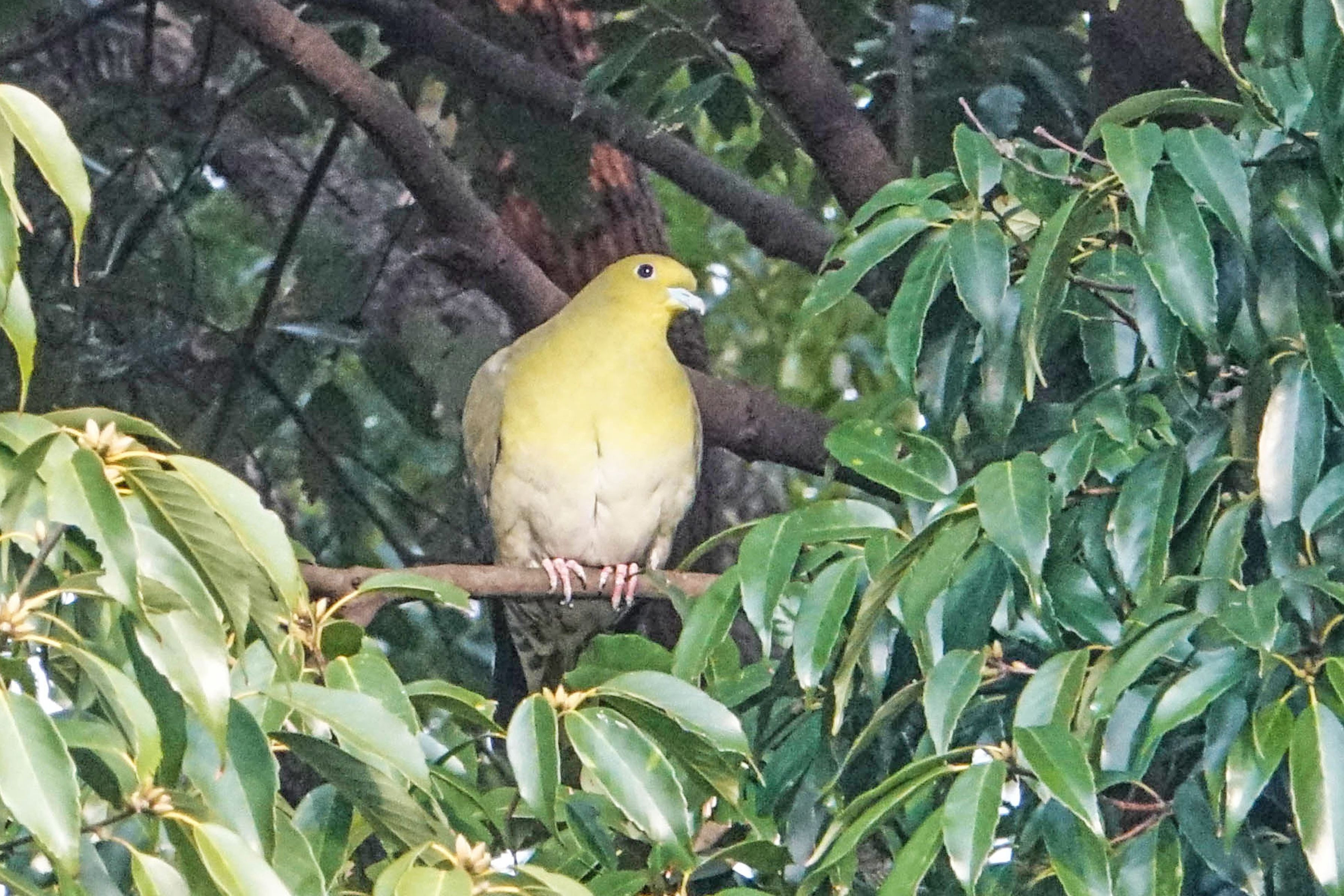 アオバト♀、アラカシの茂みから姿を見せた。