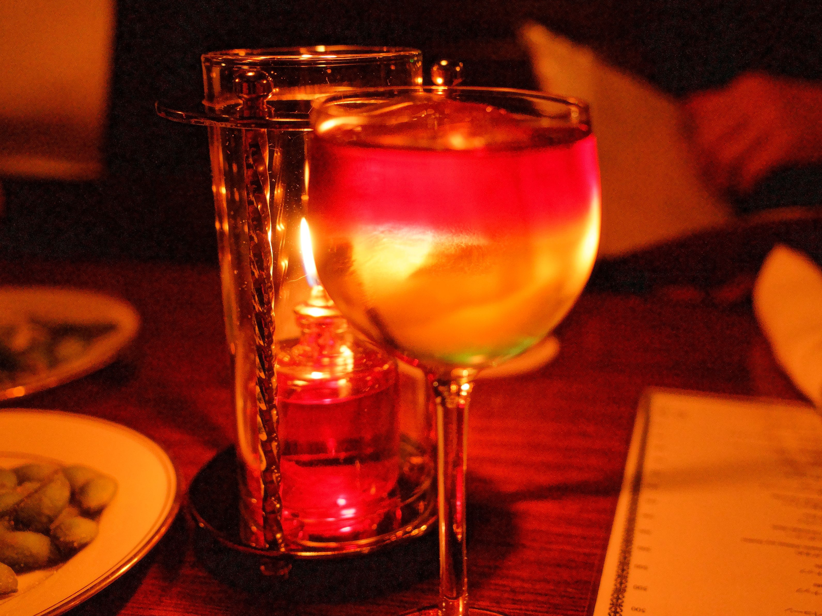 歓送会の二次会(ノスタルジア)にて。 素敵なカクテル(10月の誕生石オーパール)でしたので 撮影しましたが、、、 難しい… 森見登美彦の『有頂天家族』に出てくるバーのモデルになったお店だそうです。