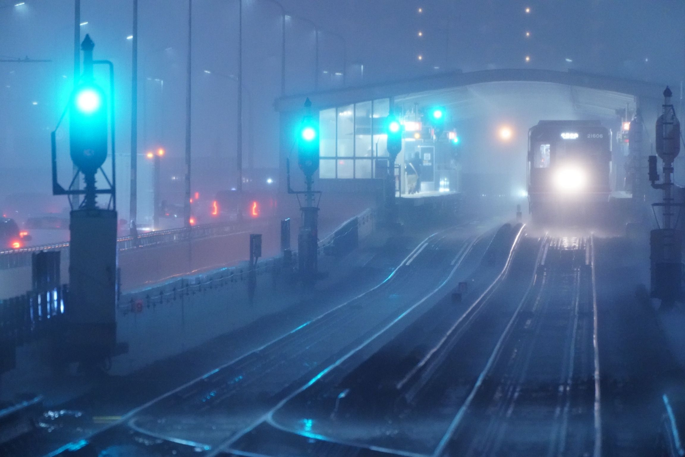 地上区間の地下鉄御堂筋線。雨足が強くなった時にちょうど撮影中でした。 連続する青信号がとても不気味です。