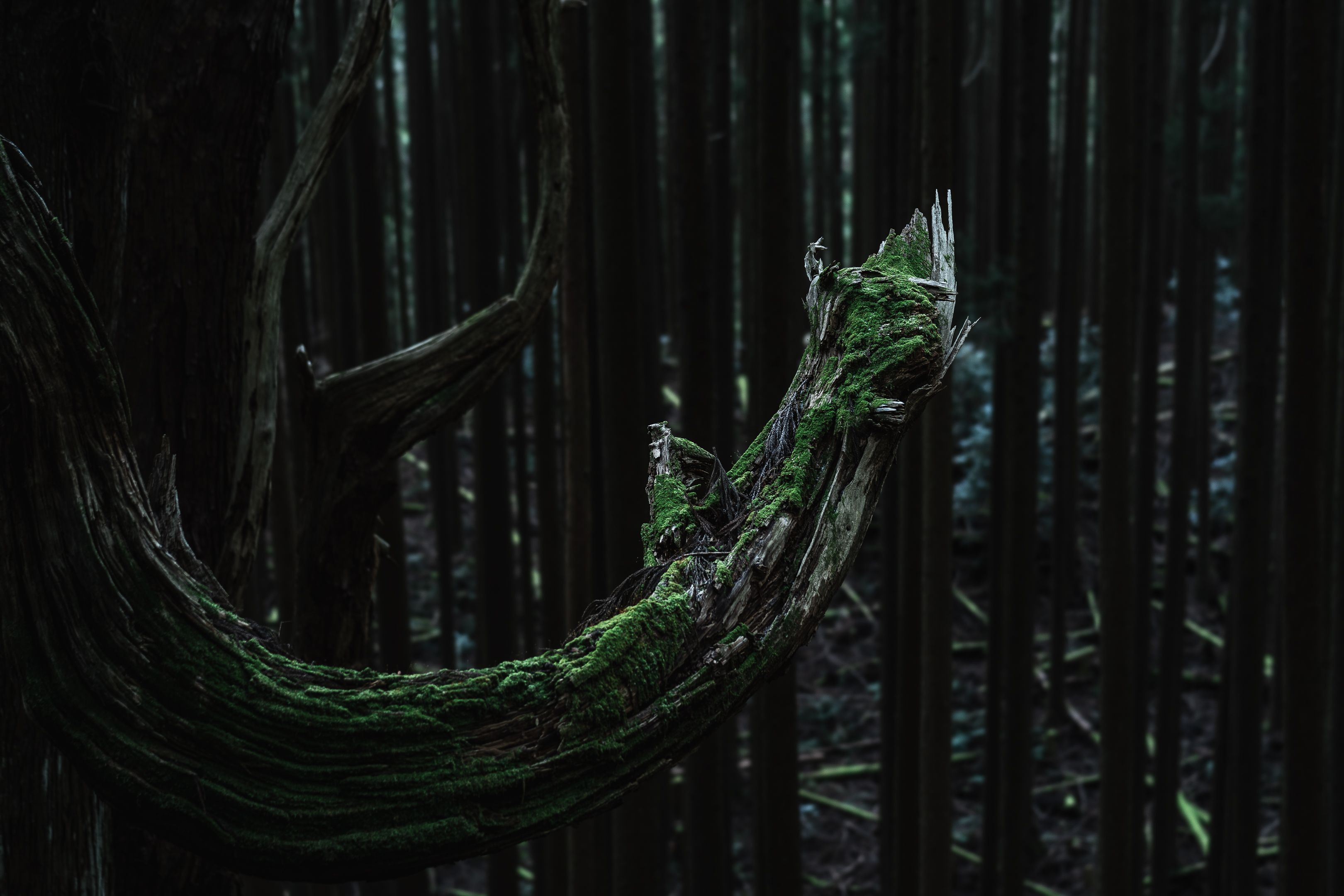 大木のたくましい枝に苔が生えている姿はまるで大蛇のようでした。