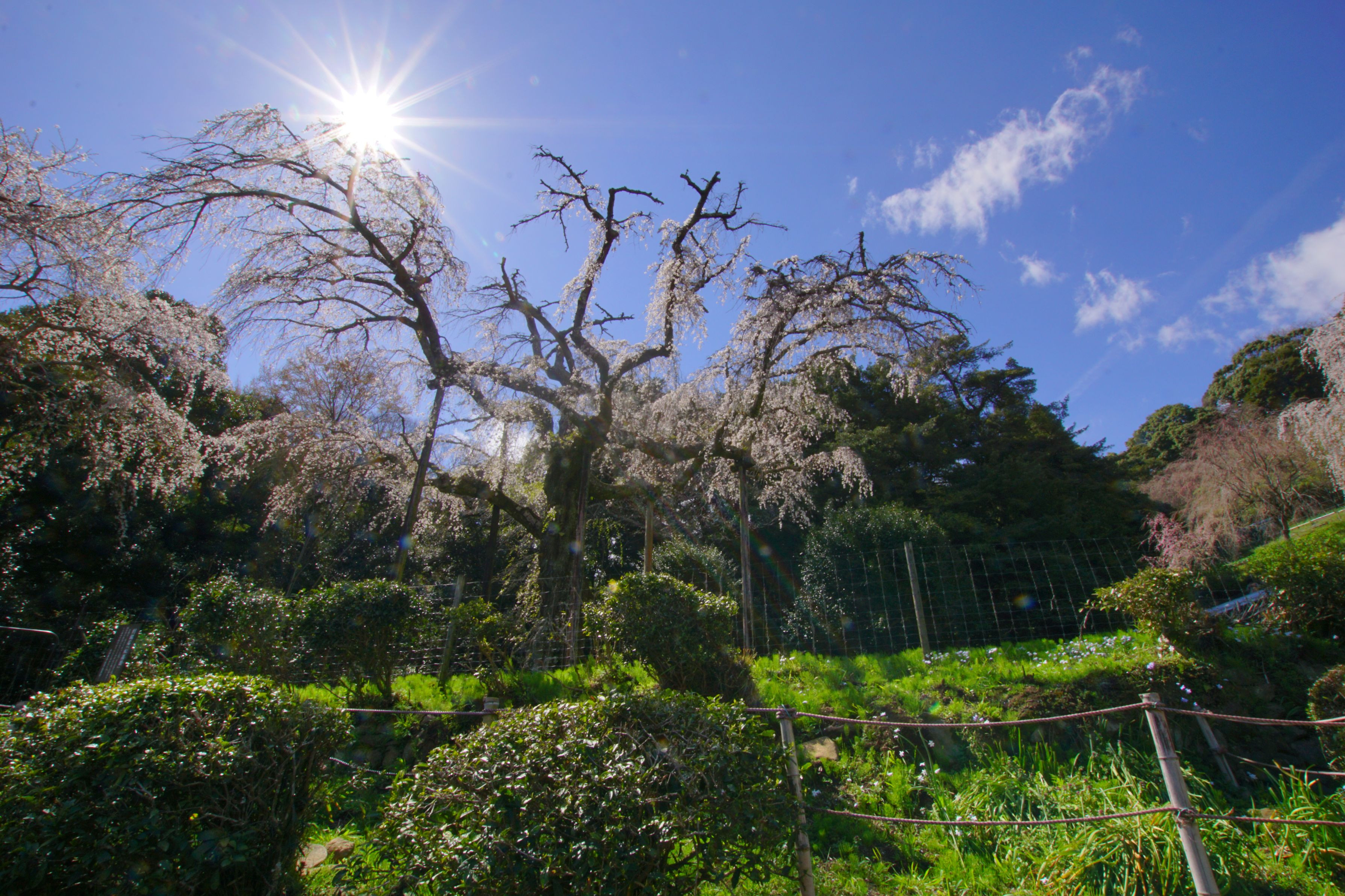 小田原の入生田にあるしだれ桜です。逆光の位置だったので、太陽をピカーッとさせました。 老木なので花の勢いがないみたい。10年以上前に行った時は、もっと花が付いていたと記憶しています。