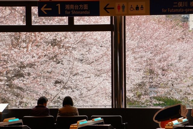 相鉄弥生台駅にはホーム両側で47本の桜の木がある。改札を入ったコンコースは桜を観れるように大窓になっており、ベンチも桜の方を向けてある。 下りホーム上の桜を見る二人を改札の外から撮ってみました。
