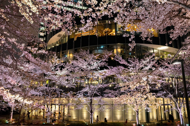 六本木、ミッドタウンの夜桜です。星空は見えませんが、ビルのあかりを背景に輝く桜も新しい風情でしょうか。
