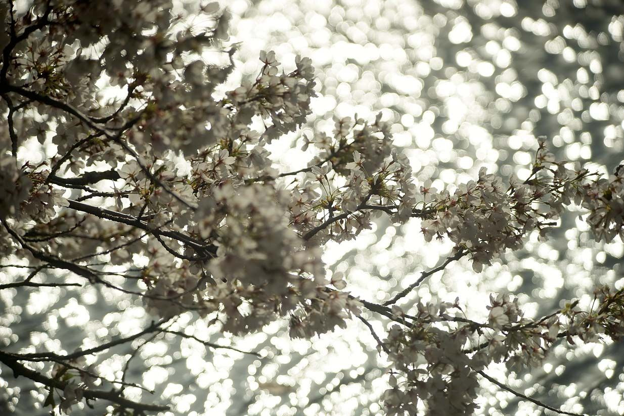 風で桜も見納めか。焦れる思いもよそに桜吹雪が舞う。残った桜が水面に輝いていた。