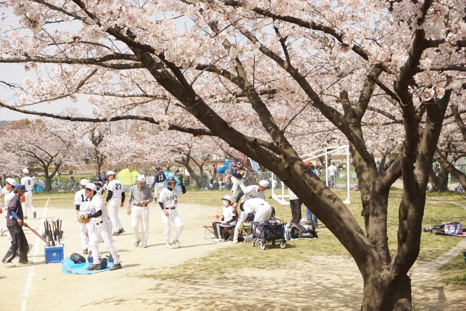 家の近くの公園で桜に囲まれて ソフトボール大会が行われていました