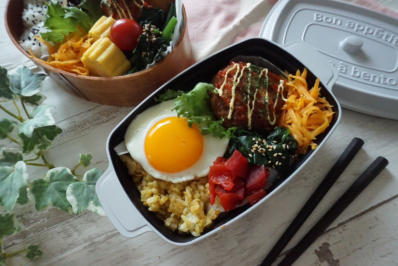 カレーピラフ 目玉焼き ミンチカツ人参シリシリ ほうれん草のガリバタソテー 福神漬け 新学期が始まっていつもの日常のスタート! お弁当も4つに増えるのね😅