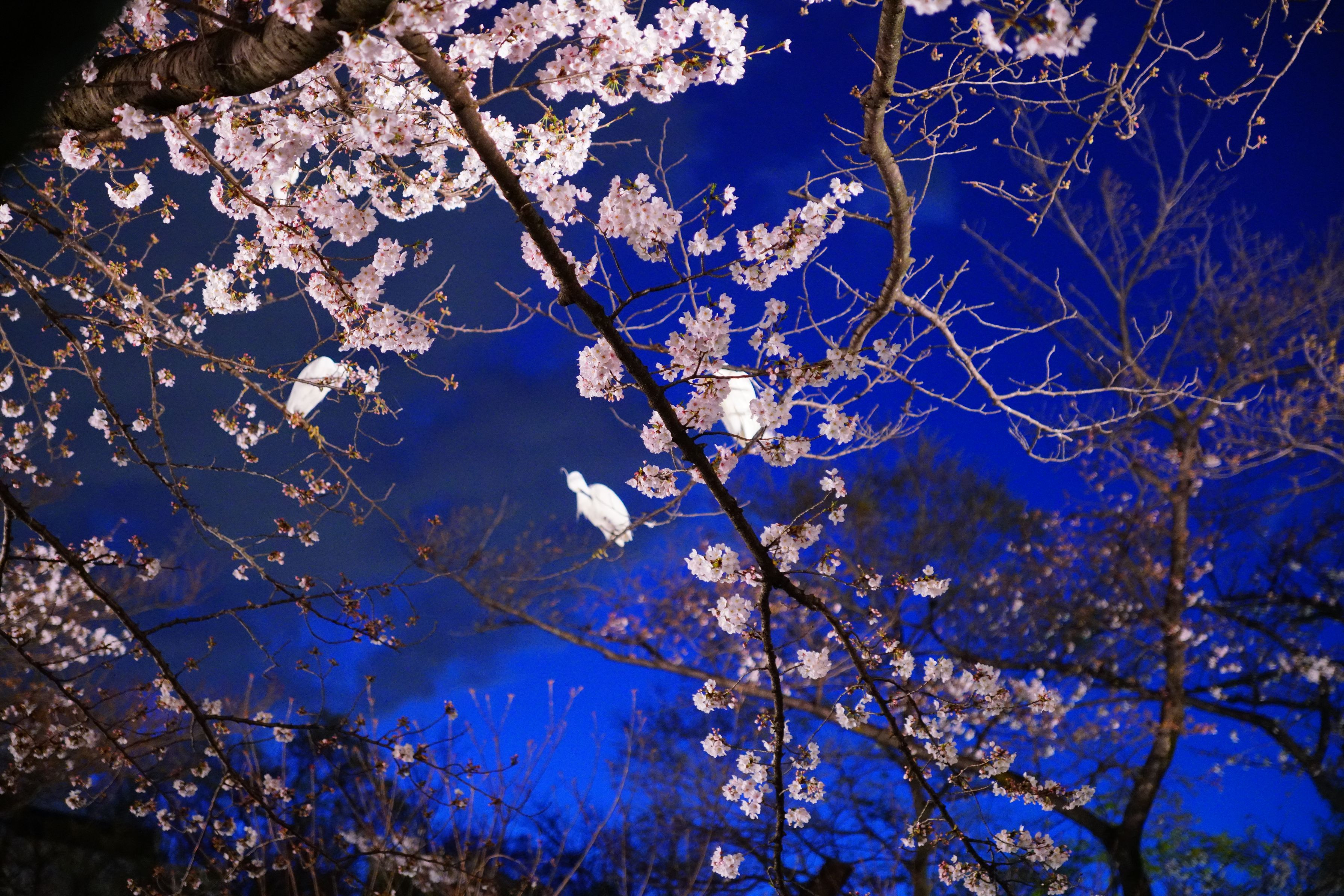 夜桜に鷺さん(?)が数羽いました。