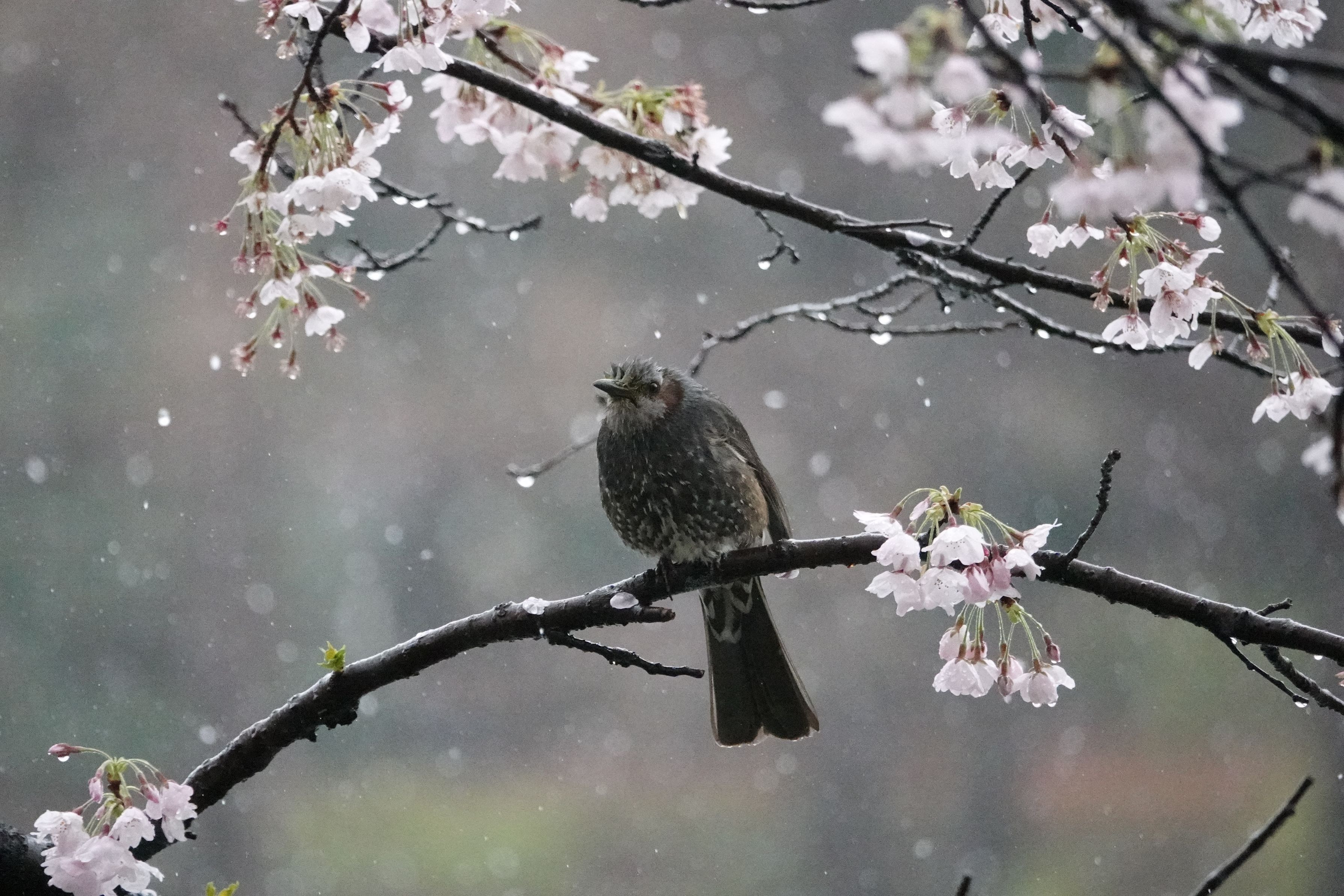 4月に入ったにも関わらず、雨から雪に! 寒い一日となった ヒヨドリも桜のもとで、あまり動かず、 空気をふっくらまとって 寒さを凌いでいた
