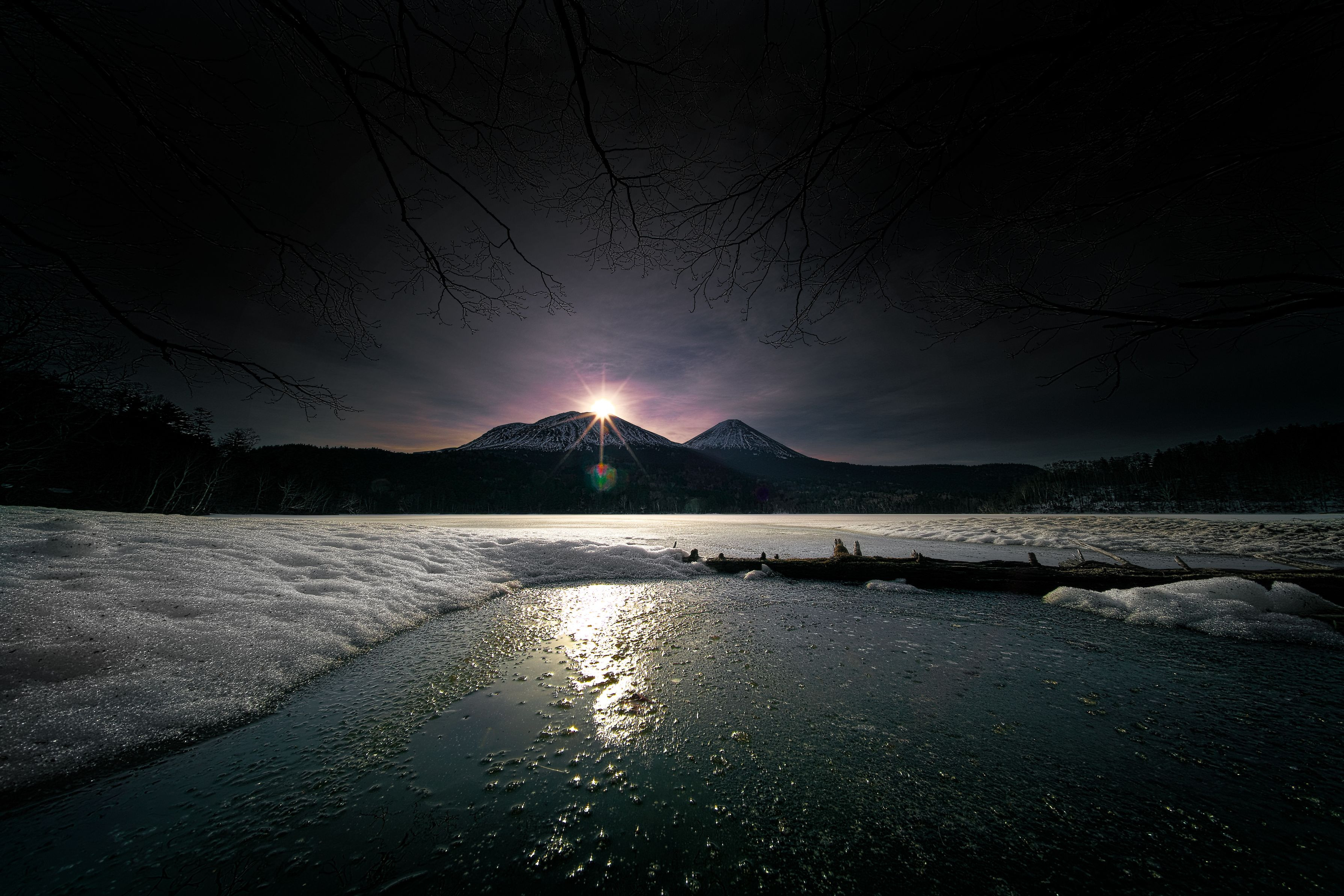 2019/4/14 足寄町 α9+Voigtlander HELIAR-HYPER WIDE 10mm F5.6+NiSi NANO IR ND64+NiSi NANO REVERSE IR GND 8 partⅠの1時間半後、雌阿寒の頂上から朝陽が顔を出しました。その頃には朝焼けの色はすっかり抜け、鈍色の空に変わっていました。
