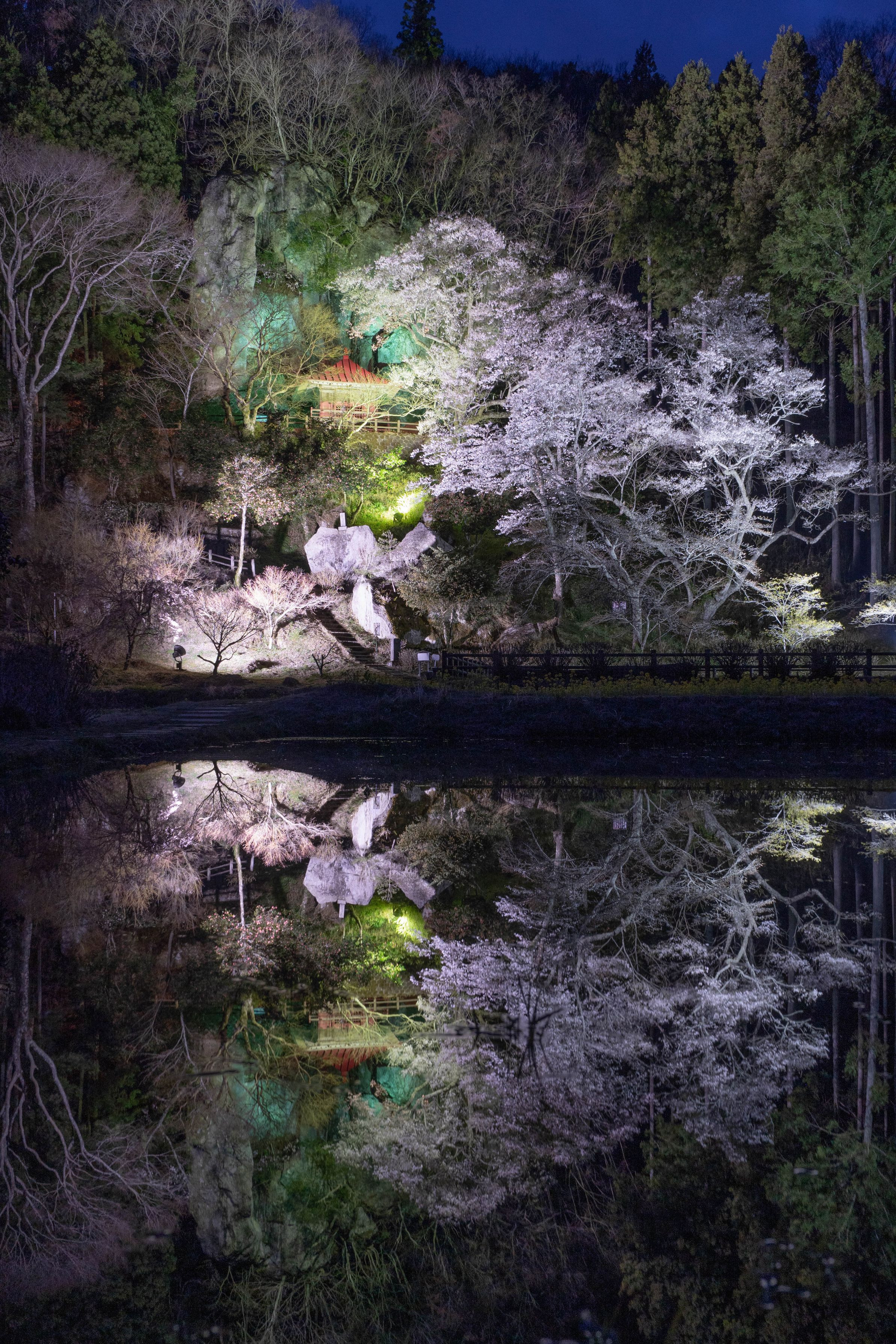 栃木県那須町の堂の岩観音です。 暗くなるにつれて水鏡の世界がはっきりと現れて来ます。 幻想的でとても素敵でした。