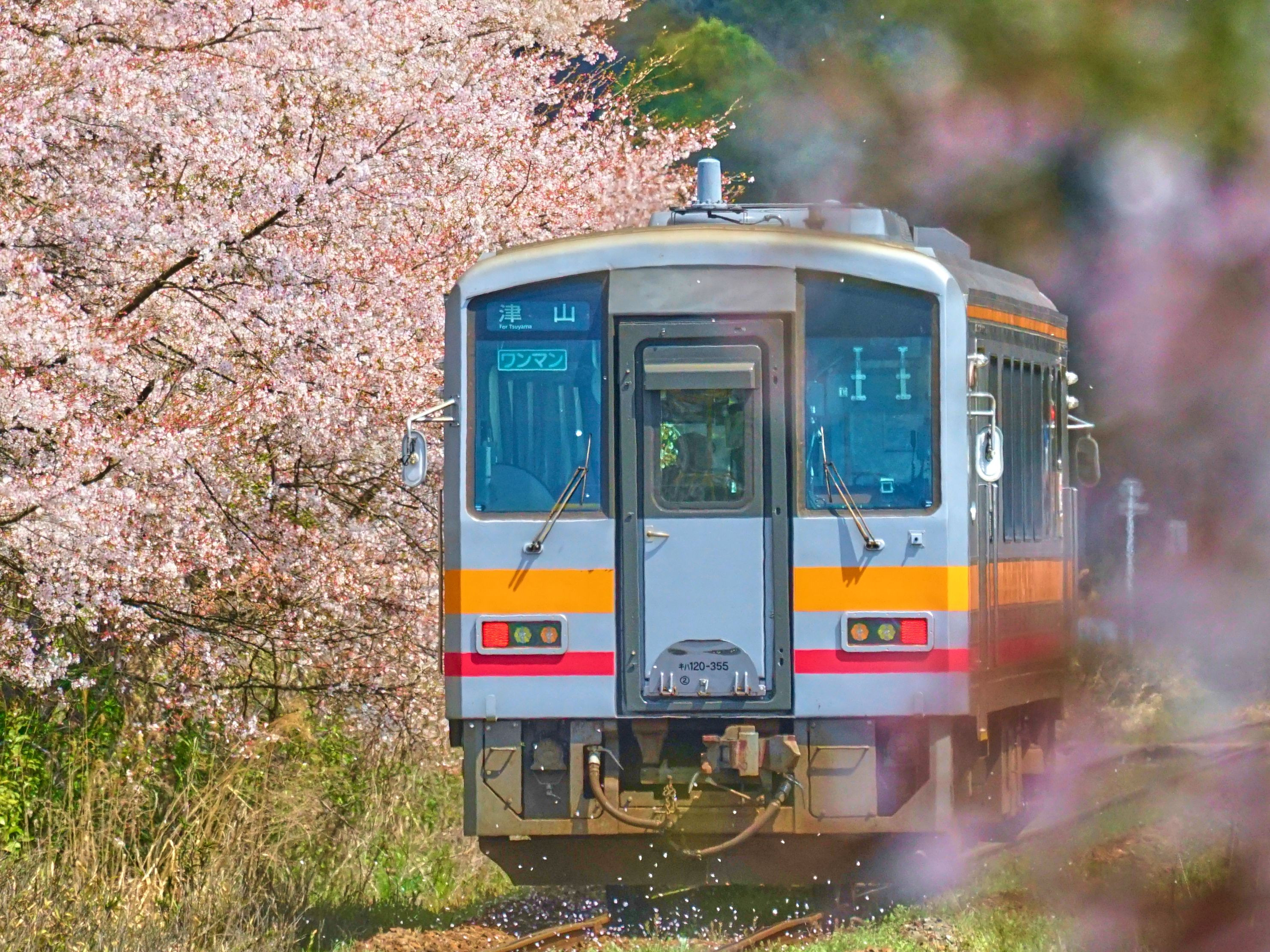 岡山県真庭市にある姫新線の月田駅のフォームから 散ってる桜と一緒に撮りました