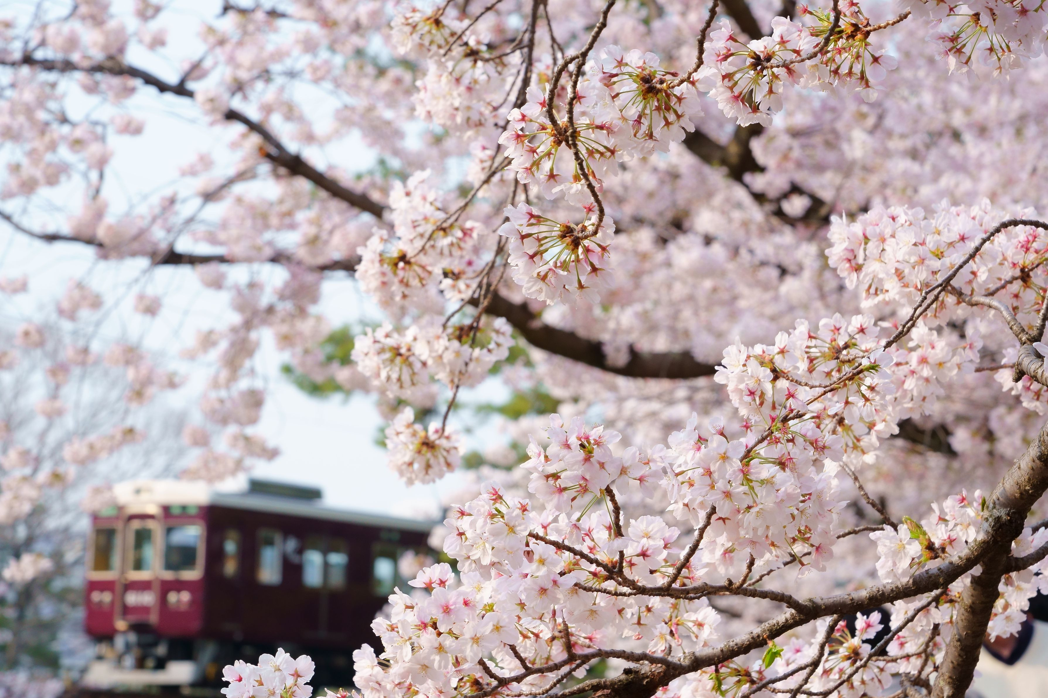毎年多くの方々がお花見を楽しむ夙川の桜。 お邪魔にならぬよう、桜越しに阪急電車が見えるポイントを探して1枚。 (阪急電鉄 夙川~苦楽園口)