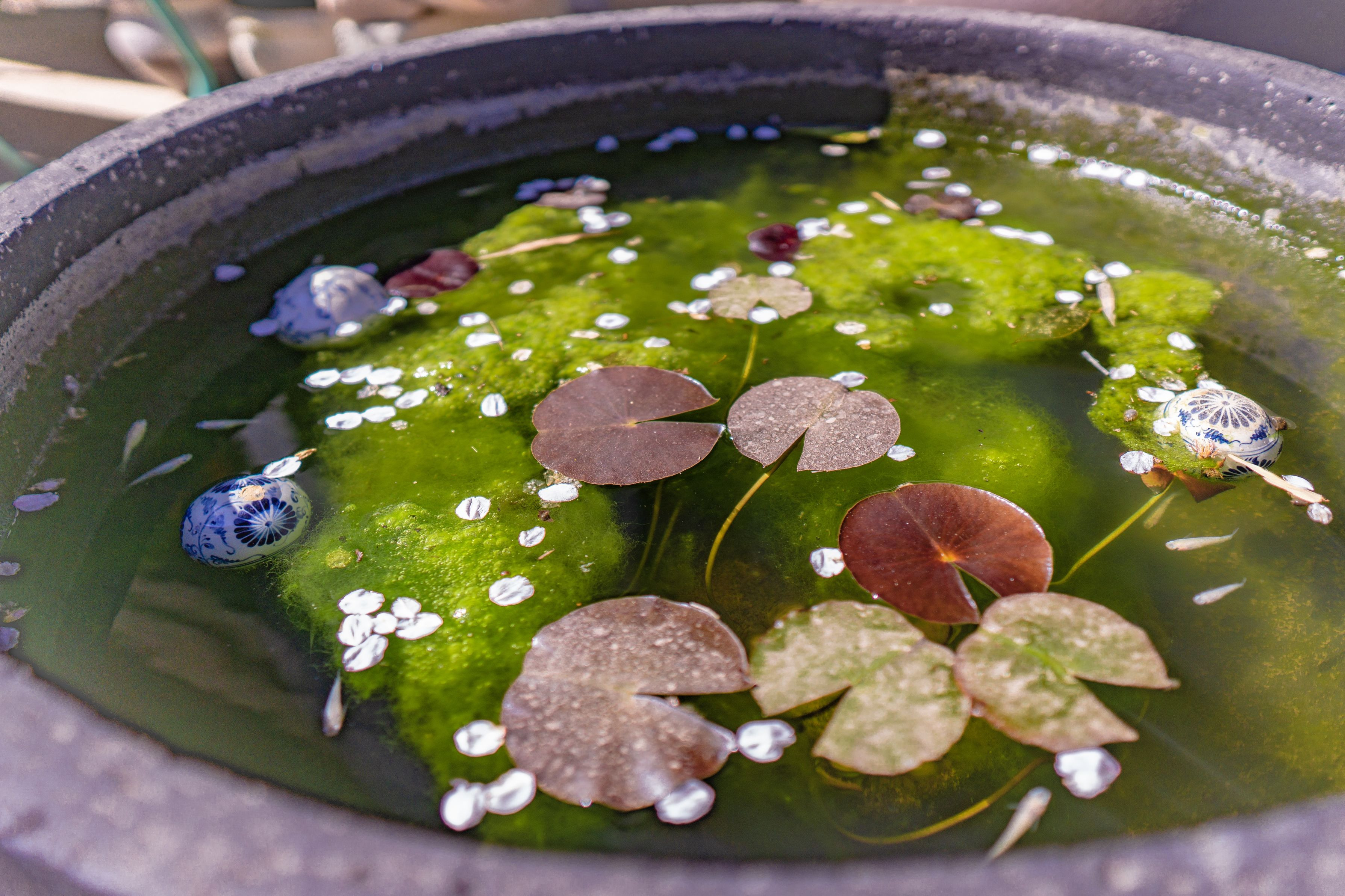 とあるお寺のツボに桜の花びらが浮いていました。 稚魚も活発に泳いでいてとても可愛らしかったです。