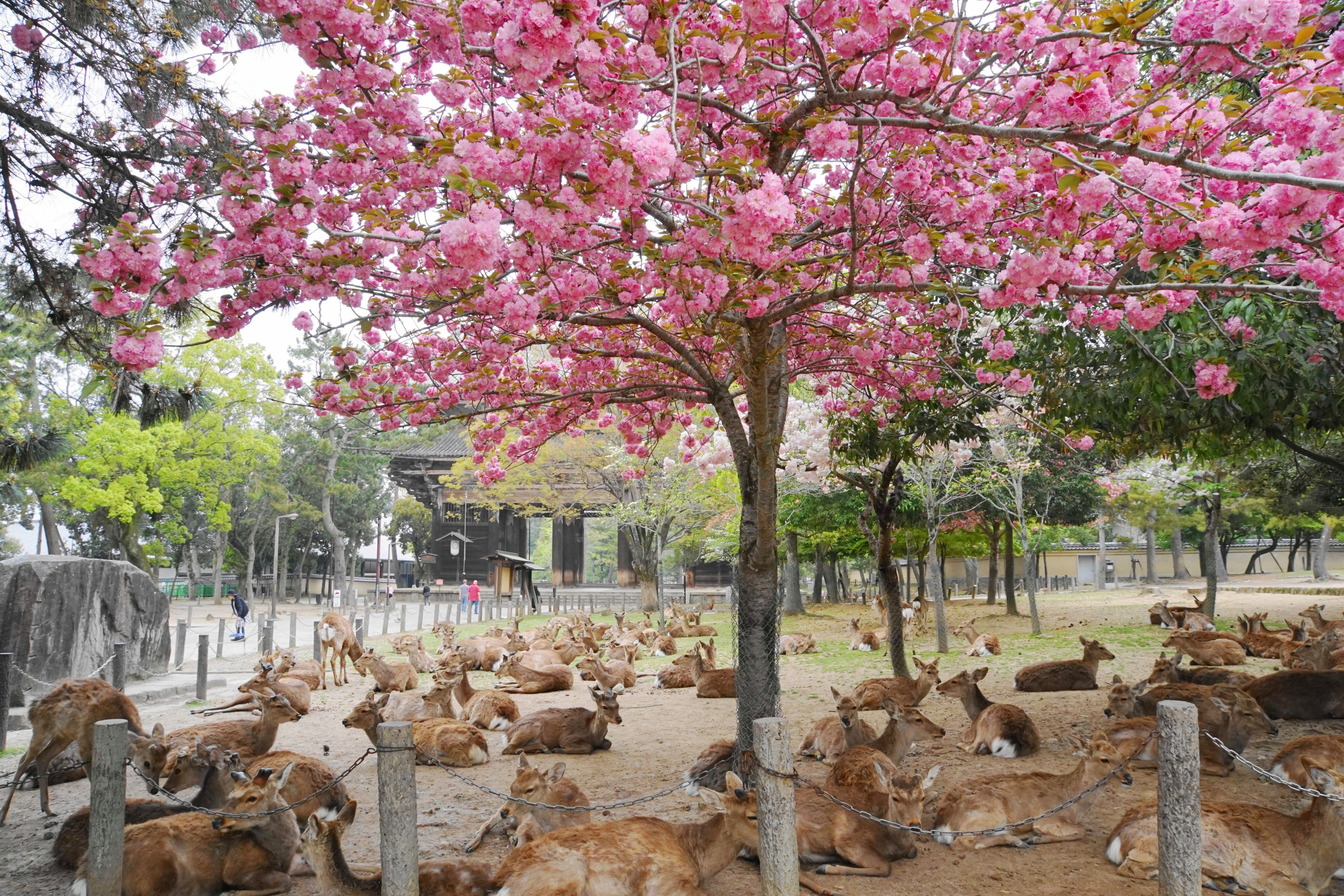 奈良の八重桜の下に多くの鹿がいました。