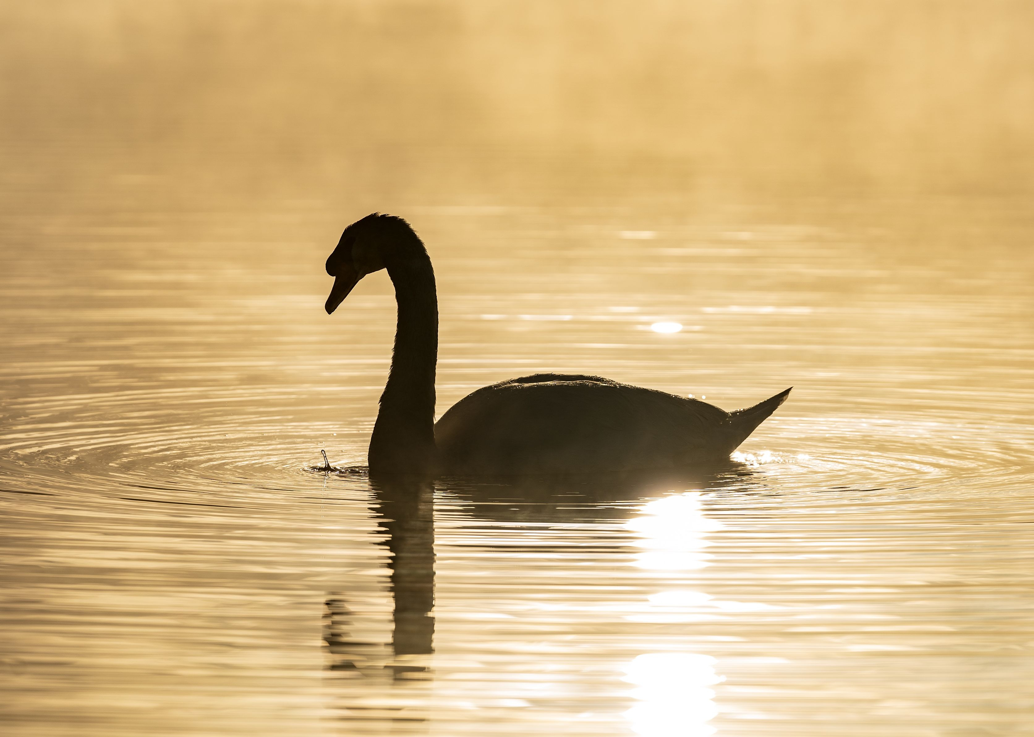早朝のウトナイ湖にて白鳥を撮影。 朝日が湖に反射し、幻想的な光景に。