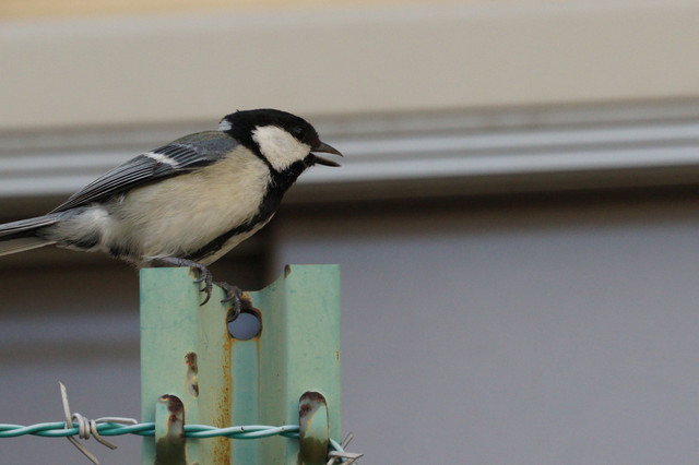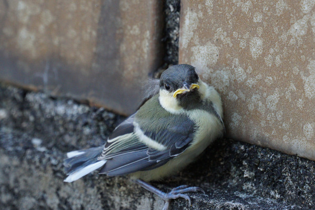 #シジュウカラ# 飛び上がり切れなかった雛に、親2羽が周りを警戒しながら呼び掛けていました。