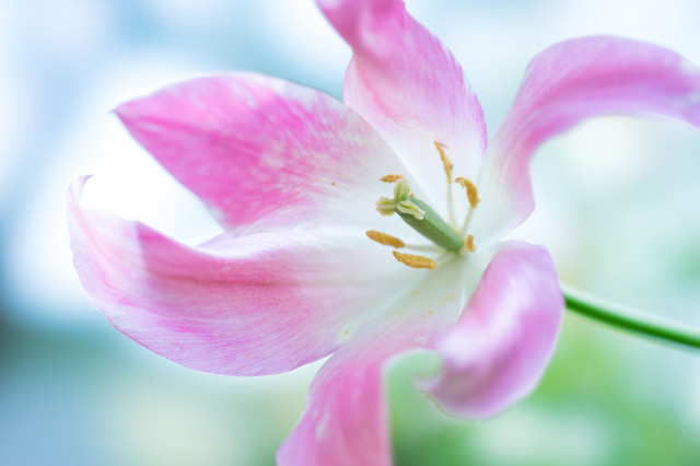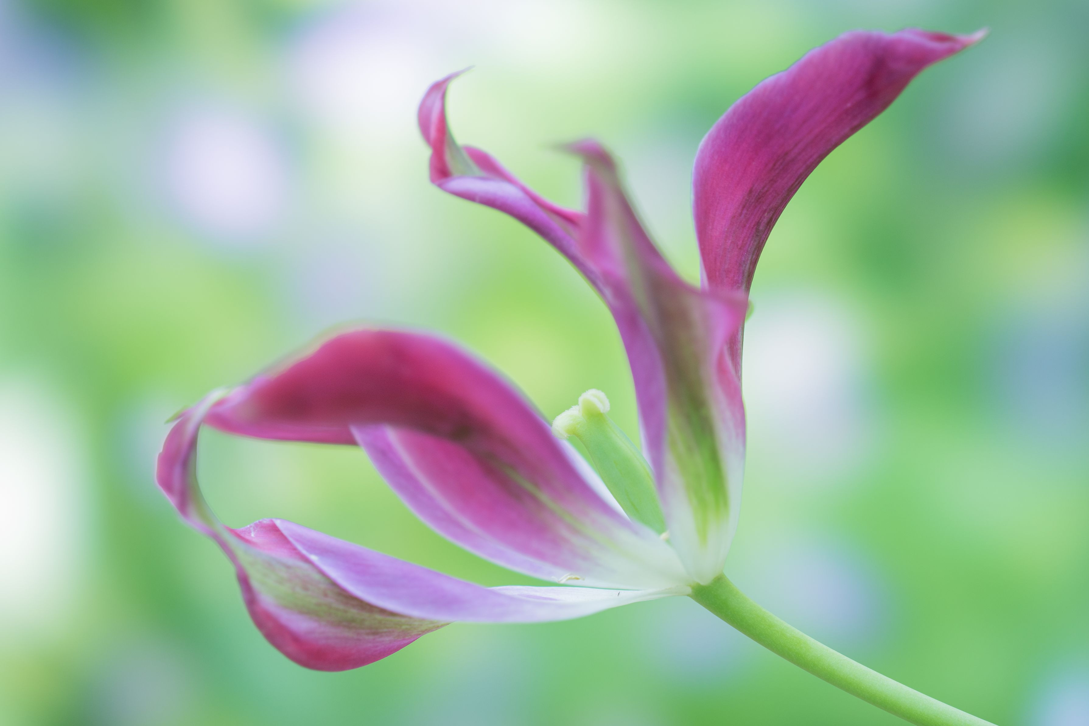 バラの咲き始めたイングリッシュガーデンに、変わったチューリップが咲いていました。名前は”パープルダンス”、踊るような花にピッタリの名前でした。