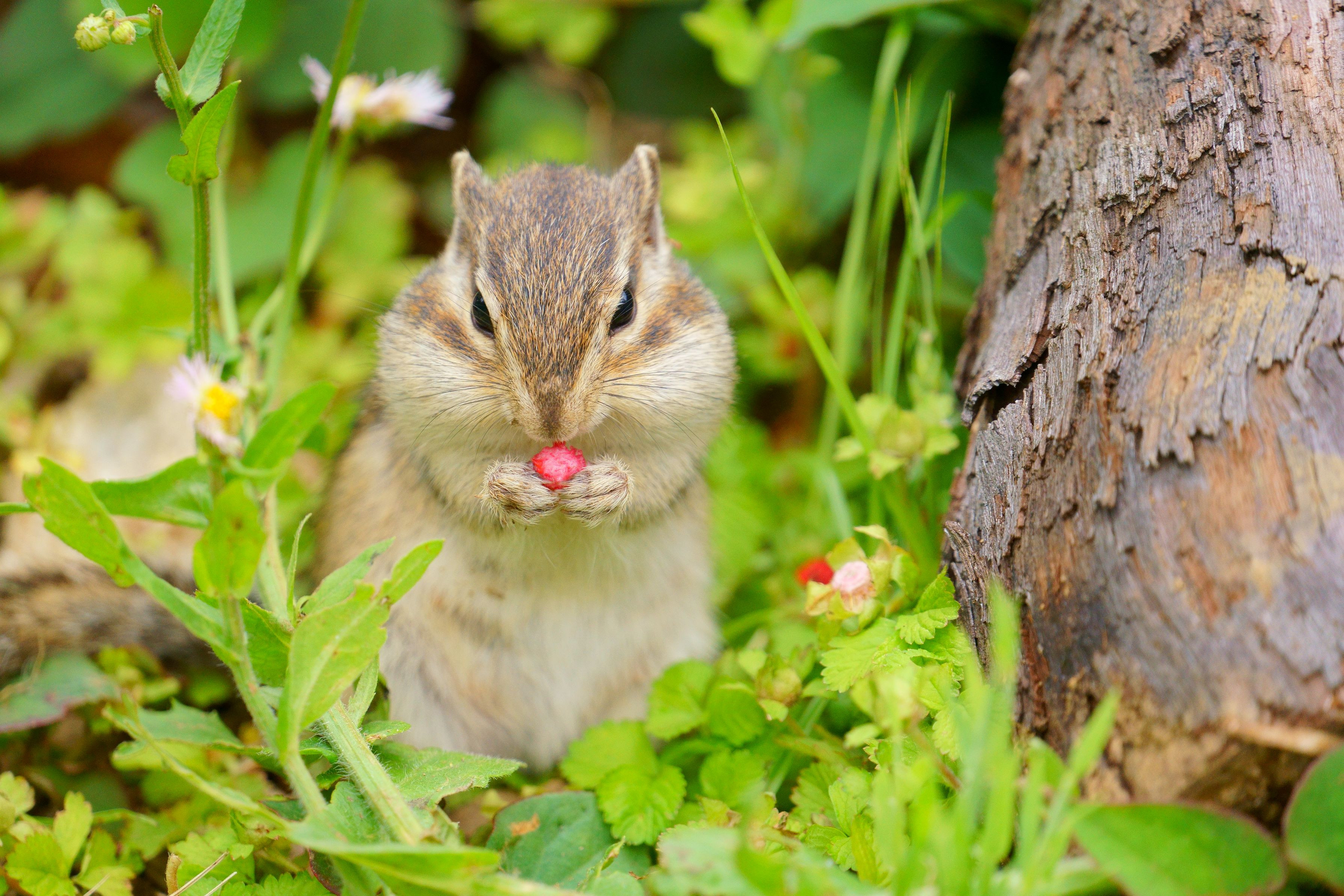 ヘビイチゴを美味しそうに食べていたシマリスです。今日は天気が曇っていたのでみんな元気に遊んでいました。