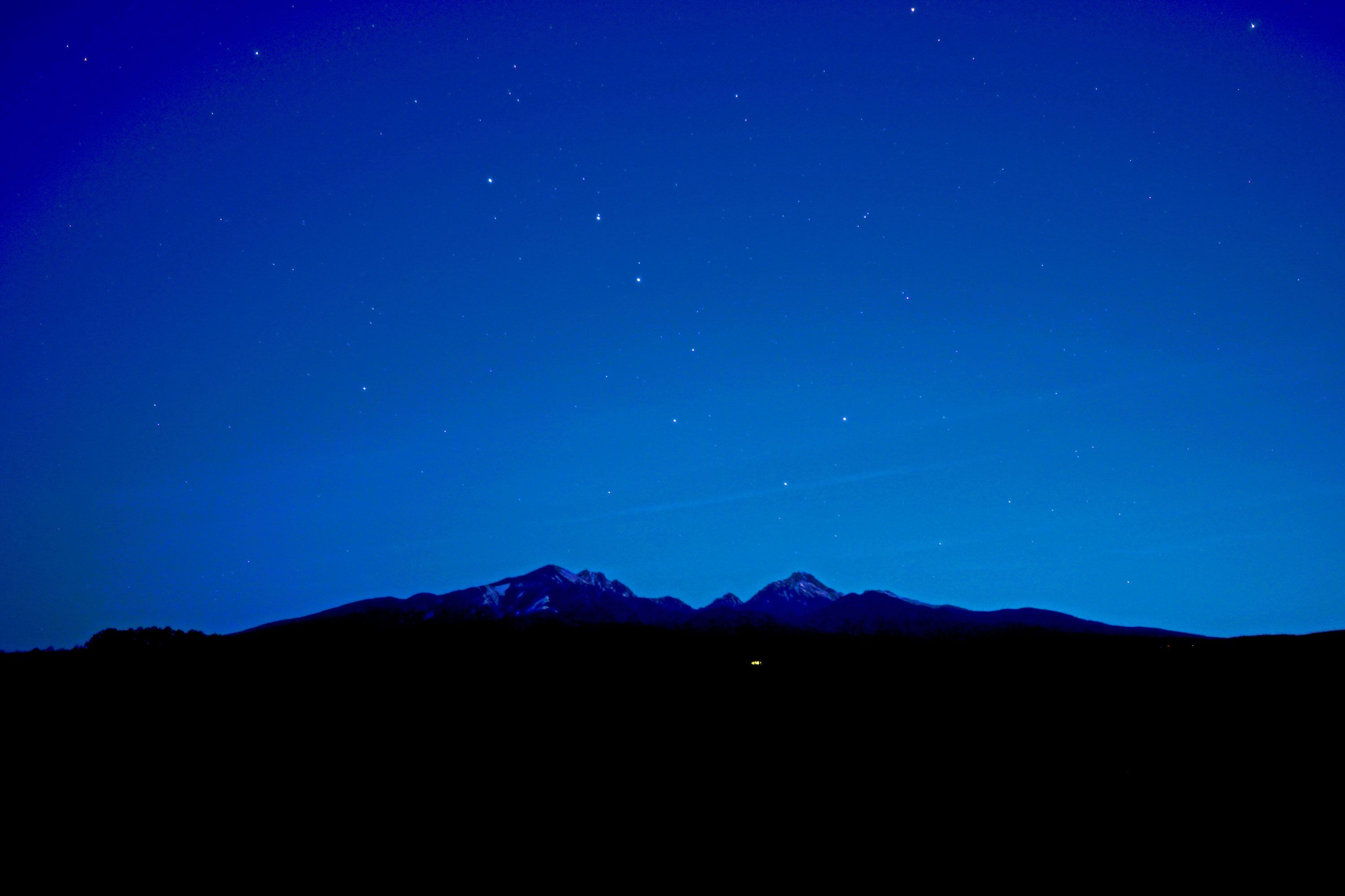 薄明が始まる頃の時間帯、わずかに明るくなり始めた空に残る北斗七星と八ヶ岳が、それぞれ静かに夜明けを待つ姿に、威厳を感じました。
