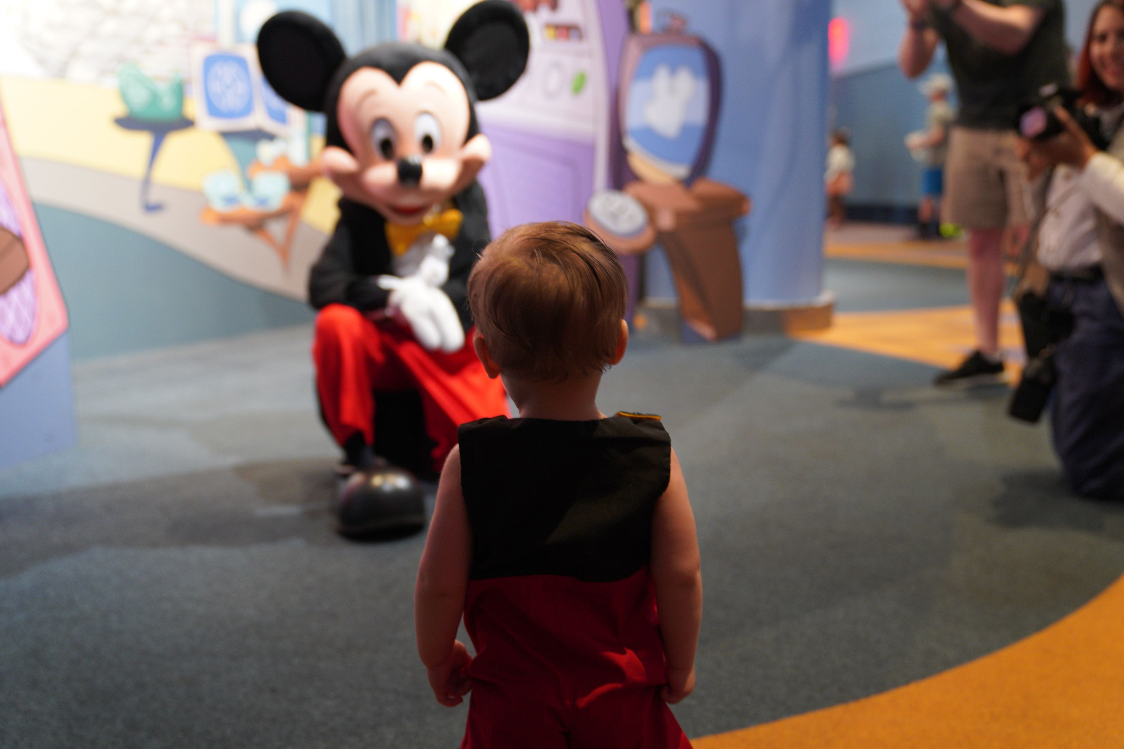 ミッキーに駆け寄るか悩んでいる少年のもどかしさと、ミッキーが姿勢を崩して少年と同じ目線になって、勇気を促している印象的な一枚です。