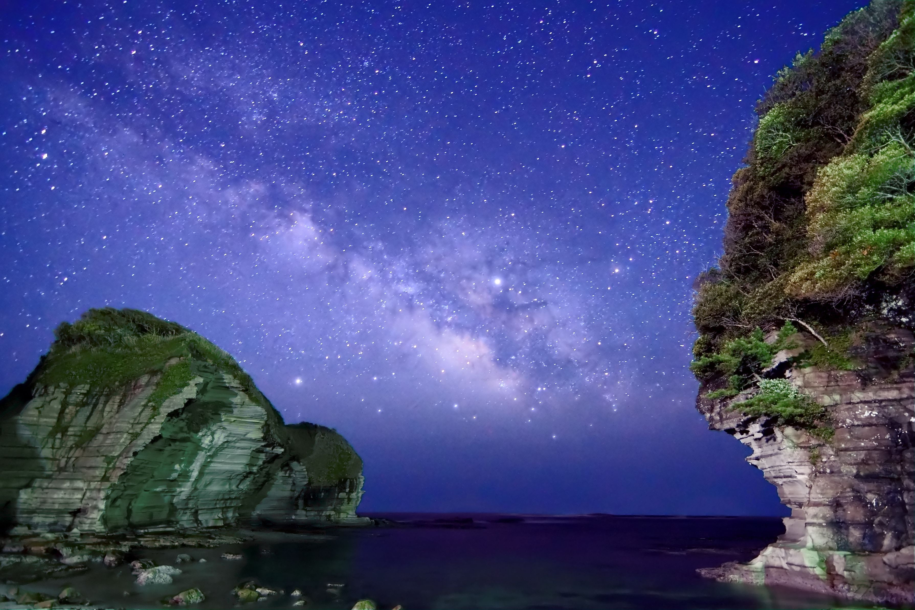 千葉県の外房から南房総にかけては夜空が非常に暗く、海抜数mでありなら絶好の天の川撮影スポットです。今回は勝浦市の鵜原理想郷にある入り江から昇る天の川を狙いました。 肉眼でも天の川がぼんやり見える恐るべき空の暗さでしたが、写真ではISO4000という超高感度と40秒の長時間バルブシャッターで肉眼では見ることができない銀河中心の星雲群まで白く浮かび上がりました。