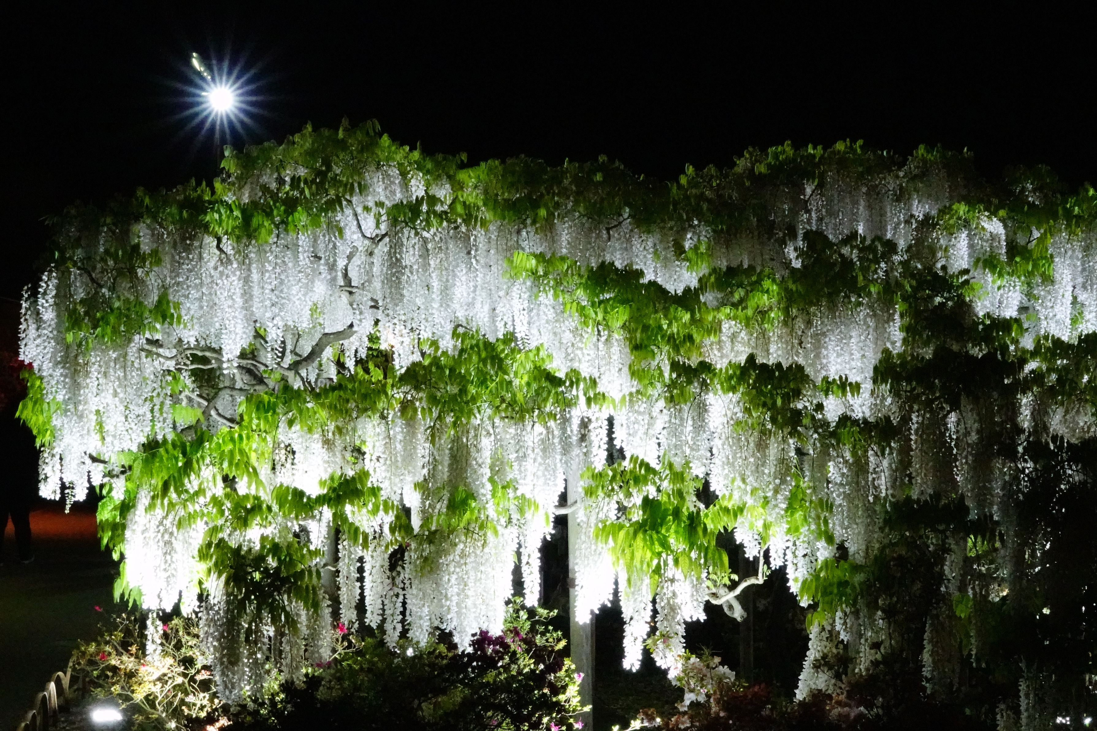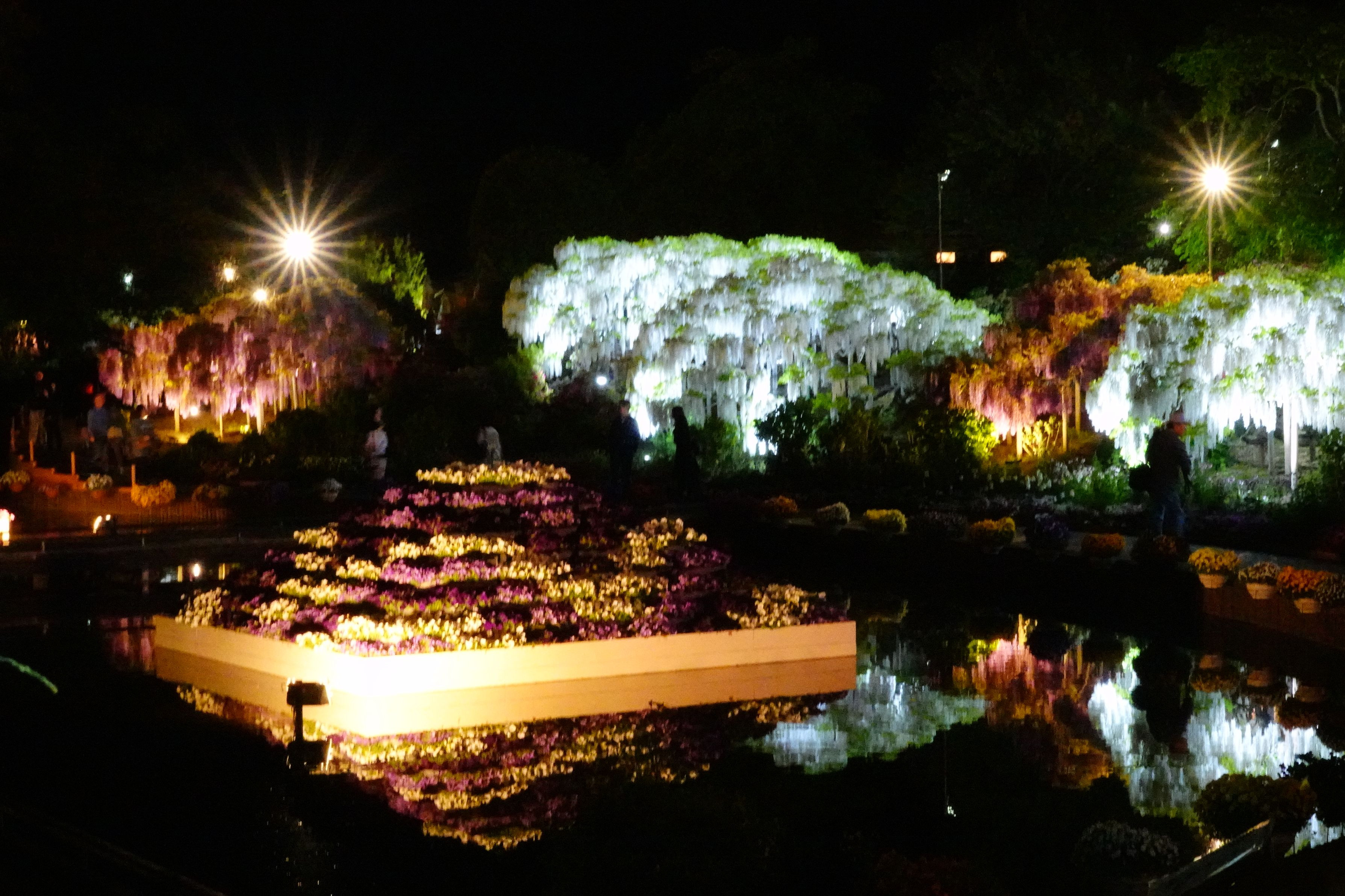 あしかがフラワーパークはGW前に訪れ うす紅藤は美しかったですが、大藤の満開にはちょっと早く、 白藤は蕾、黄色藤は何処?という状態でした。 TVで白藤が見ごろと放送していたので、 ライトアップはまだ見たことが無いこともあって出かけました
