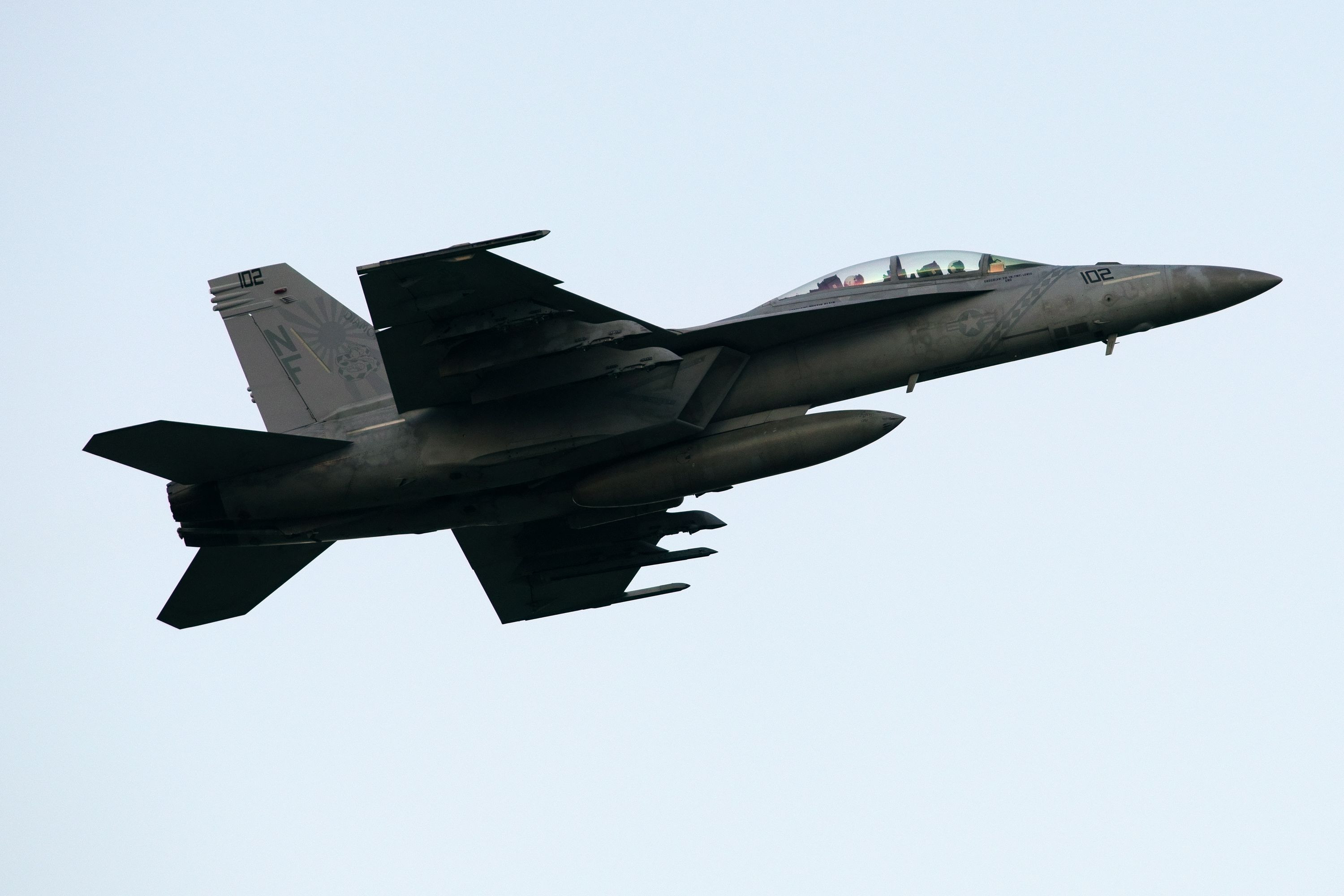 VFA-102/Diamond backsのロービジスペマ機NF102が上がらず、帰るに帰れない状況が続き、日が陰り諦めて撤収判断、荷物をまとめていたらクリアランスが入感。厚木名物の午後の雲で完全に光線が遮られてしまいました。あと30分早ければ・・・。尾翼の旭日旗の証拠写真という事で。 トリミング