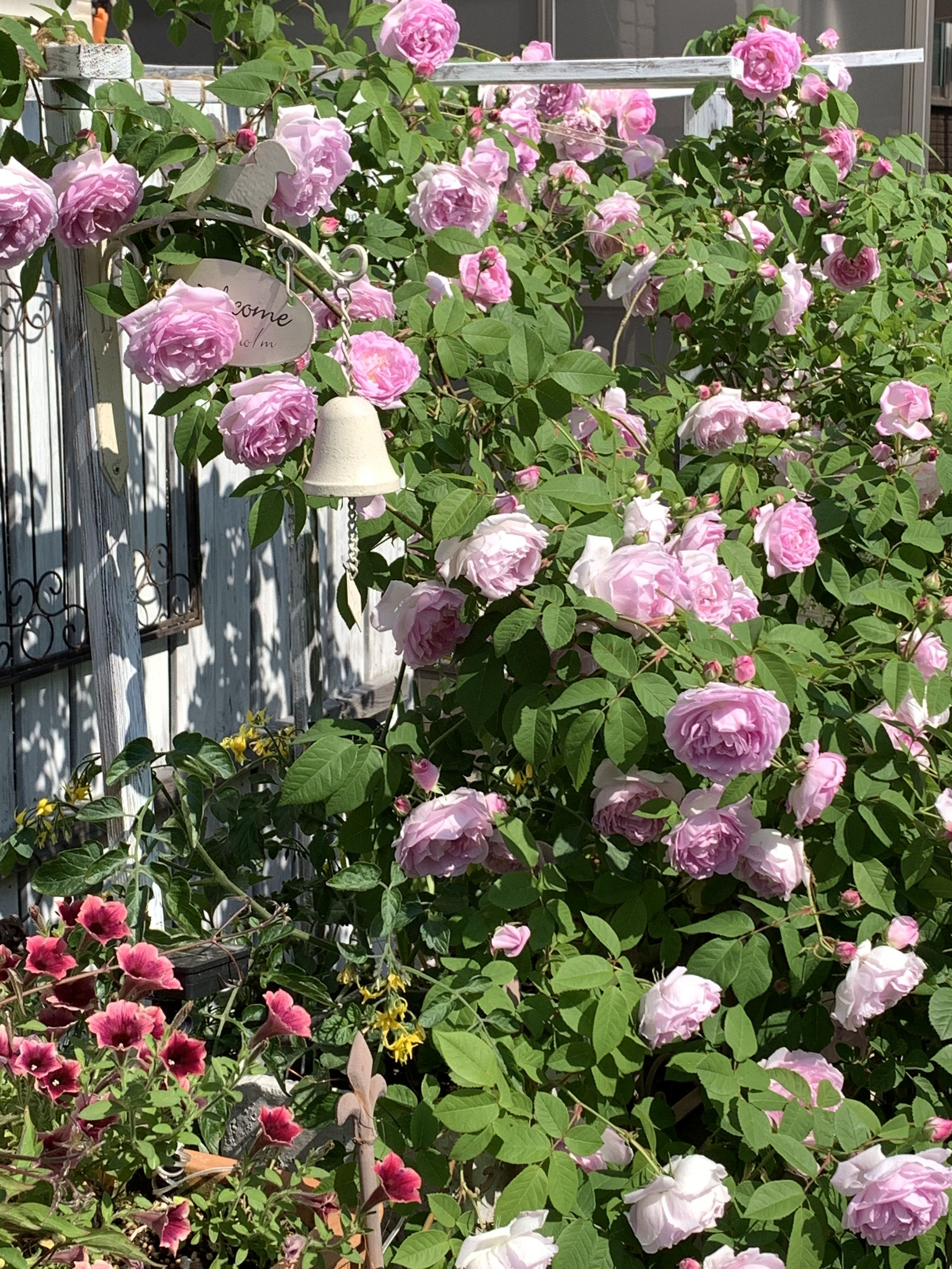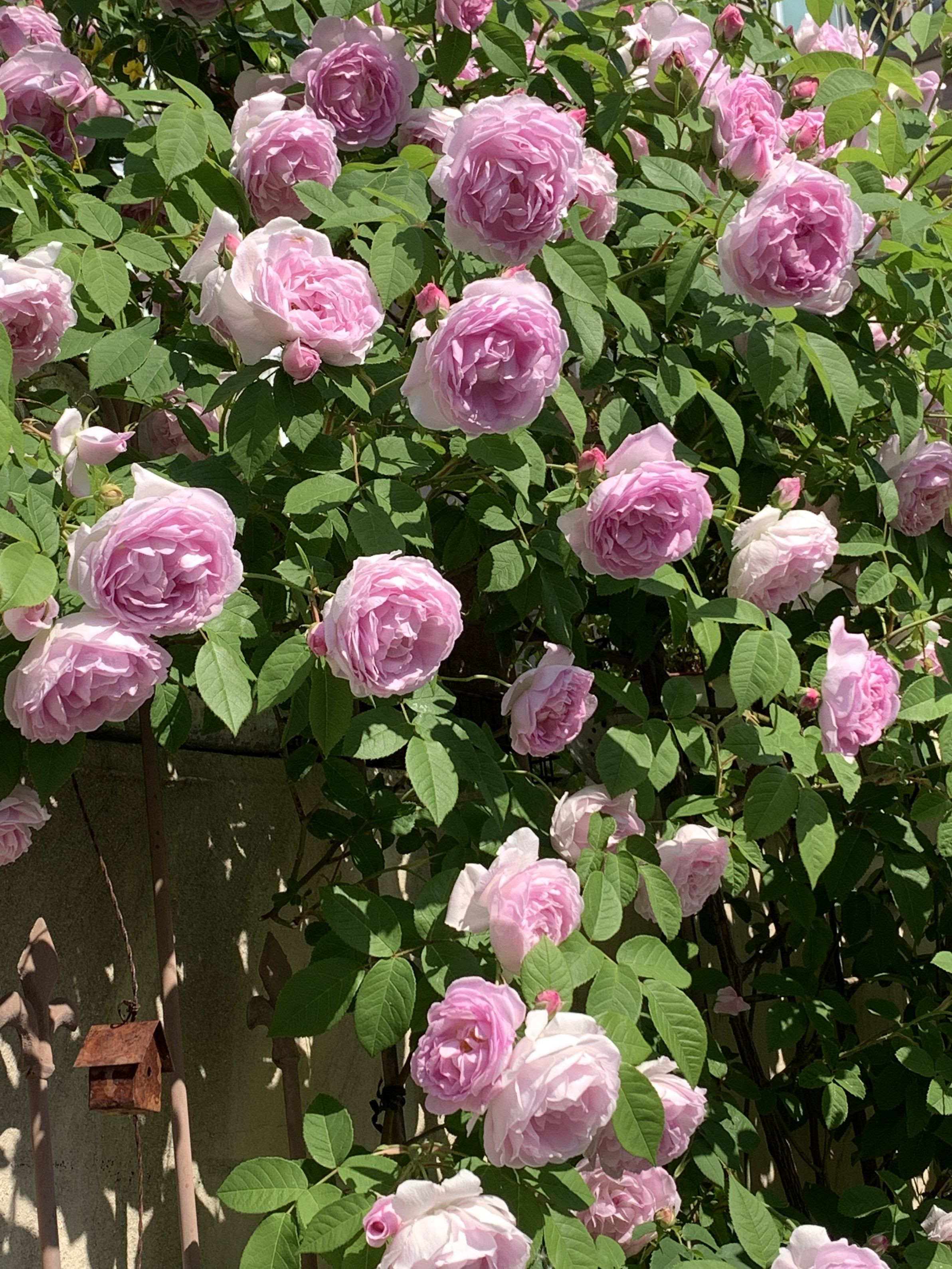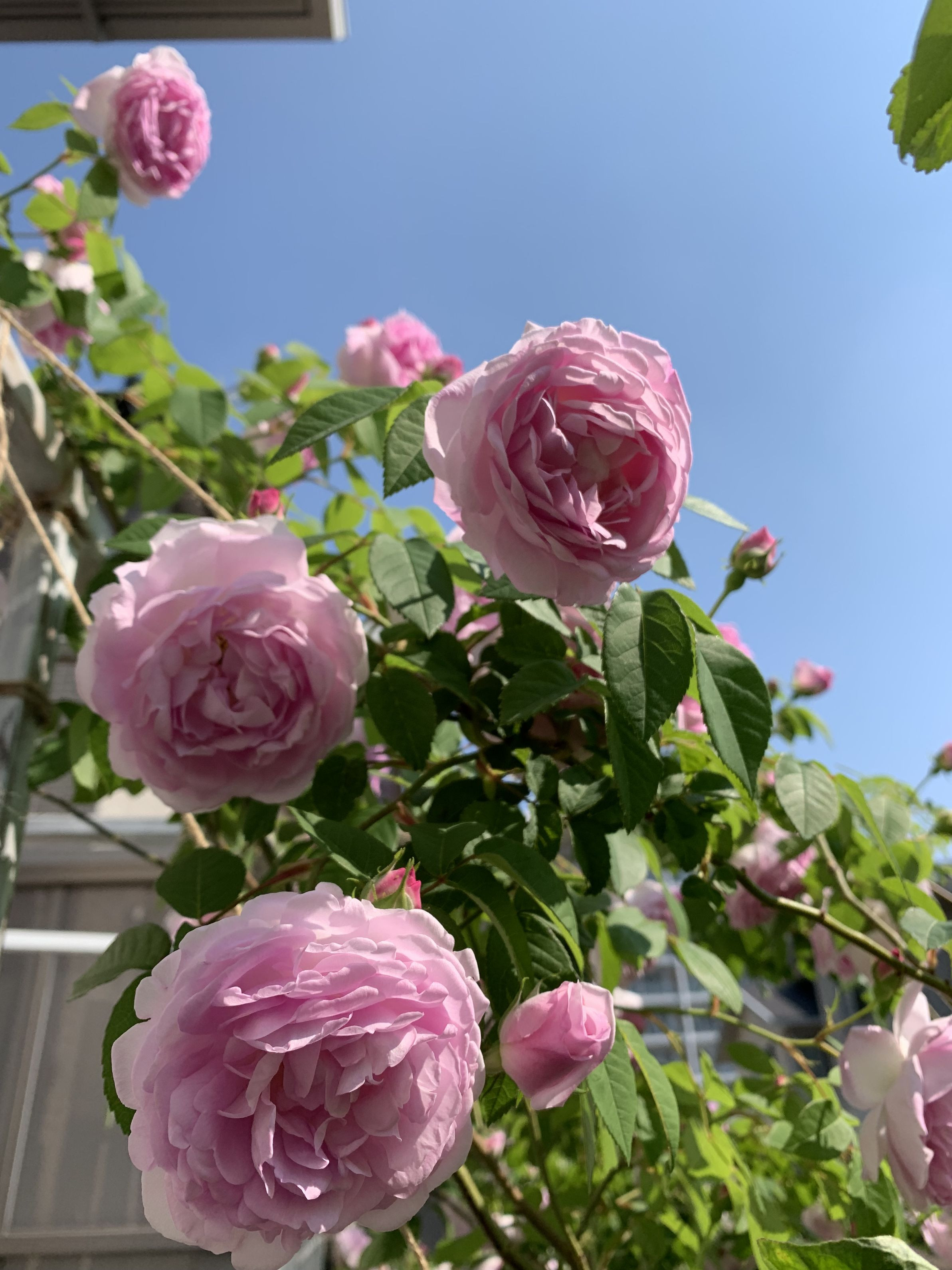 今年は、ミニパーゴラを作ったから 見上げられる😍 デュセス ドゥ ダングーレーム 優しいピンクで辺り一面 甘い優しい香りにしてくれてるよ〜