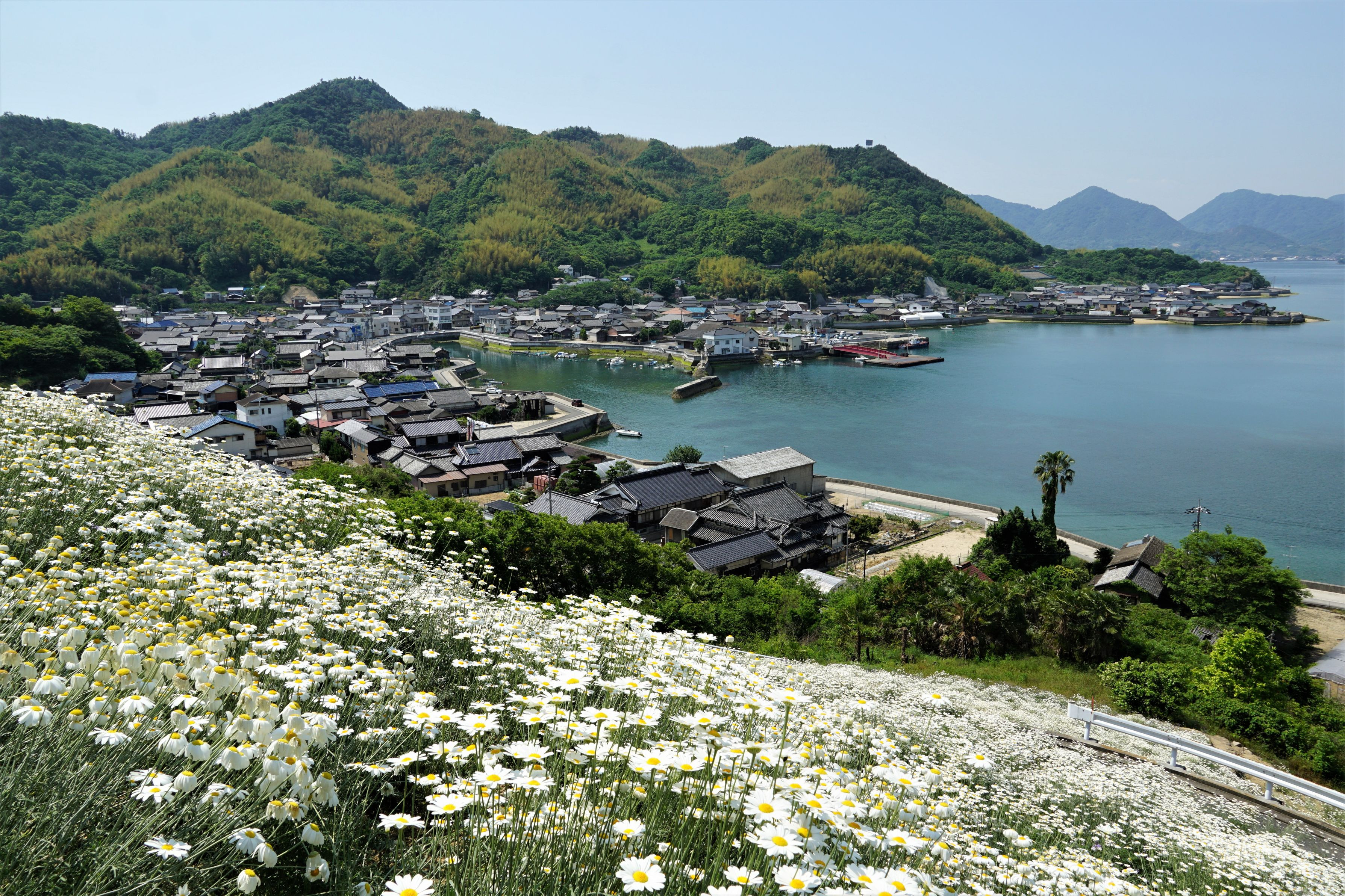 かつては蚊取り線香の原料として栽培され、5月になると島全体が真っ白に染まっていたそうです。 港を望む急な段々畑に咲く除虫菊、とてもきれいでした。
