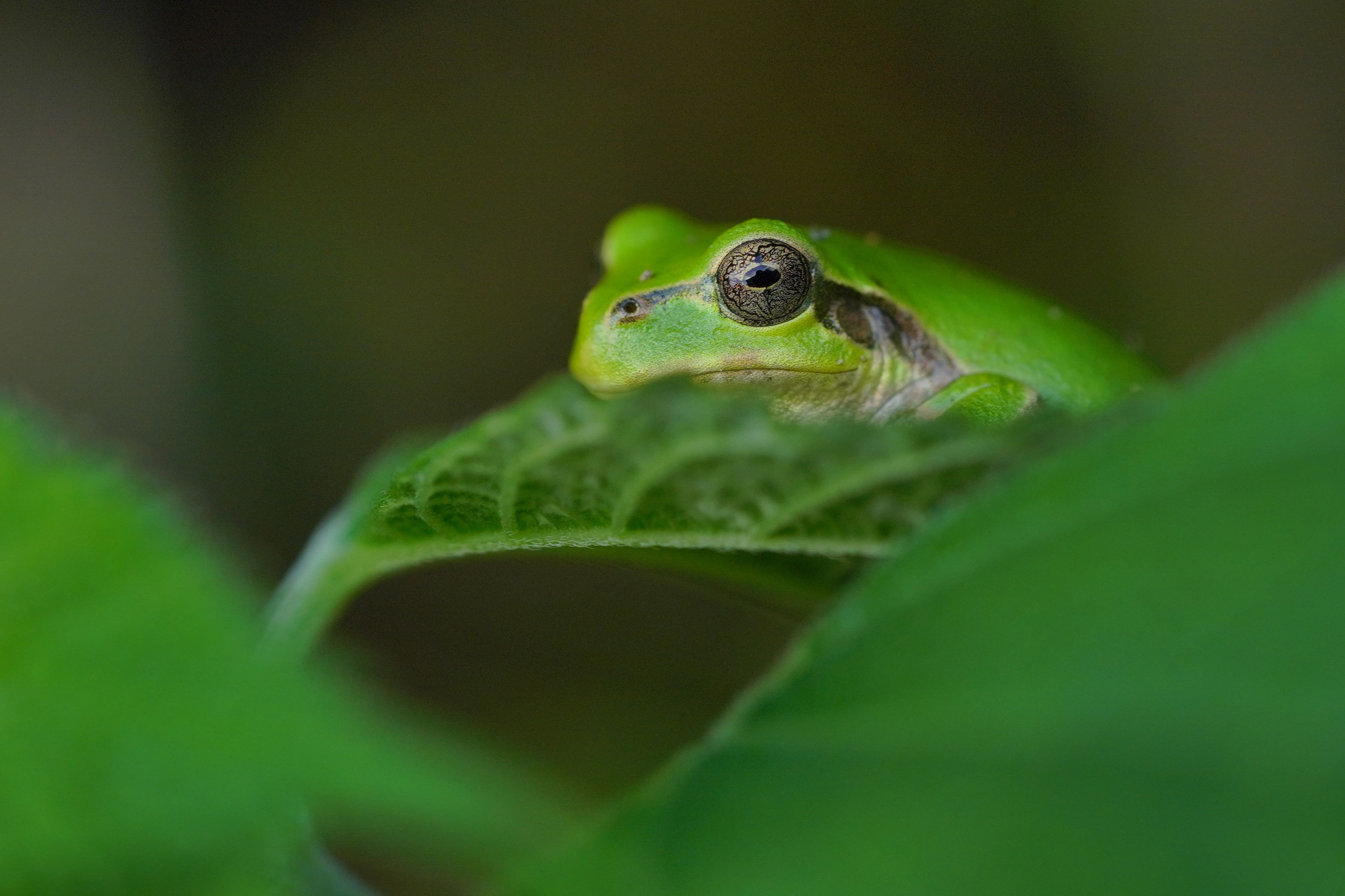 1枚目がアマガエル令和初ショット。2枚目は翌日。ほぼ同じ場所です。同じ個体?でしょうか、わかりません。1週間ほど通って探していますが、その後は出会えていません。夜明けに探さないと難しいのでしょうか、それとも年々減っているからでしょうか。 2枚目はトリミング、明るさ調整しています。