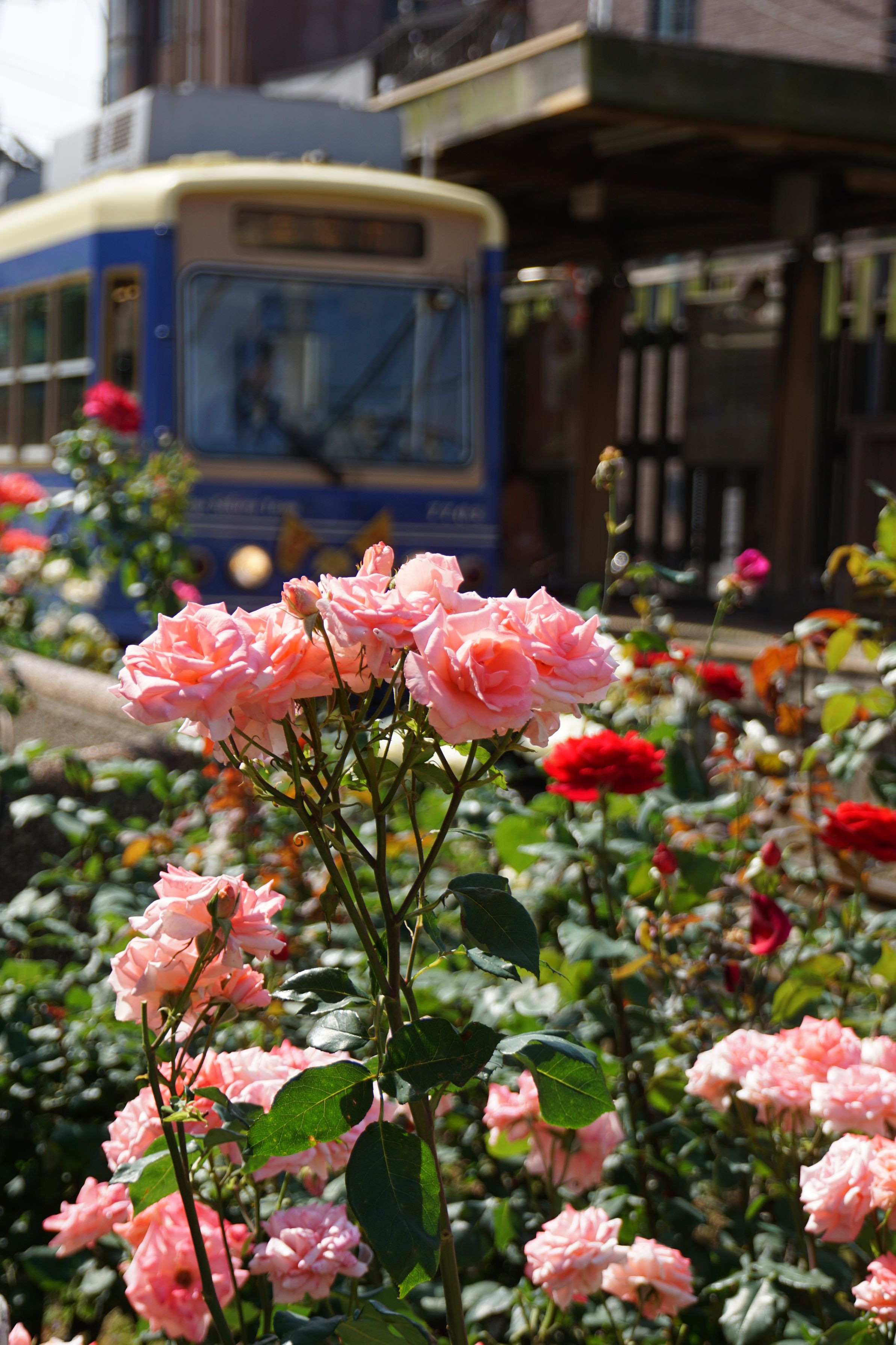 今日はワンコのいない散歩です。都電沿線は薔薇づくしでした。