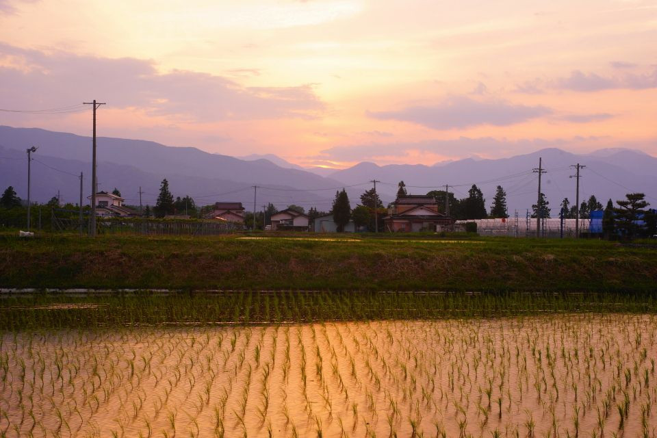 農作業で忙しい一日が終わると、 夕陽が早苗田の水面を赤く染めていました。