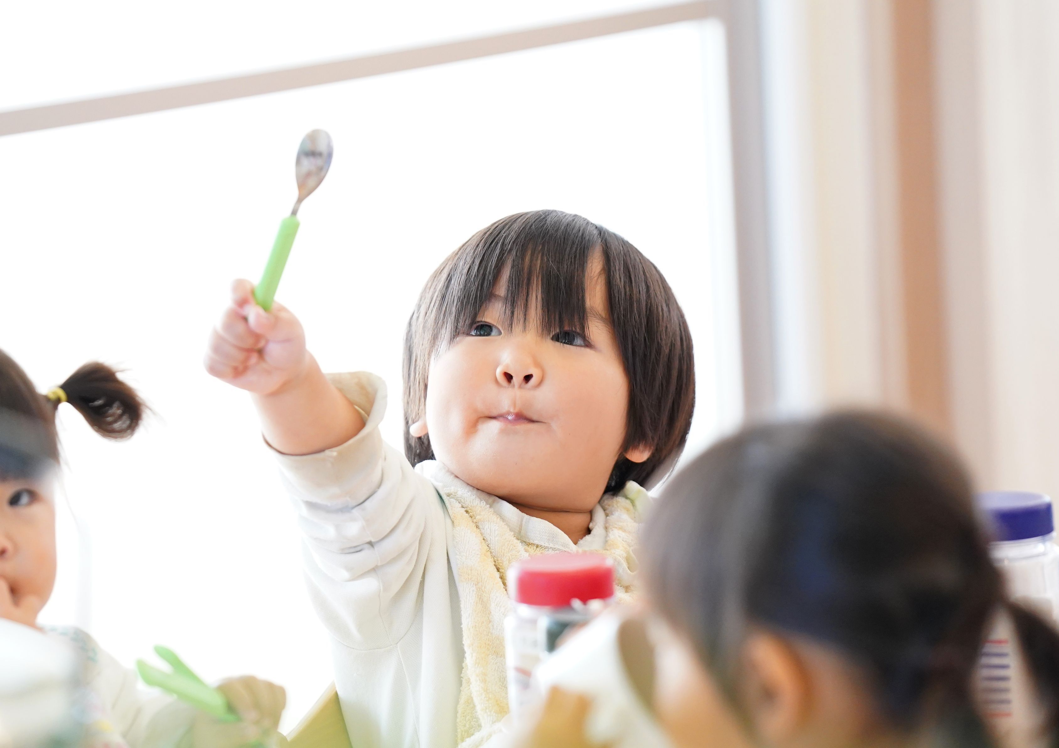 楽しい、楽しい ランチタイム♪ スプーン、持ってきたよ!って言ってるのかしら?( *´艸`) きゅっと結んだおくちが何とも言えない可愛さです。 ※こども園さん、保護者の皆様には写真掲載の許可をいただいております。 (*'▽')