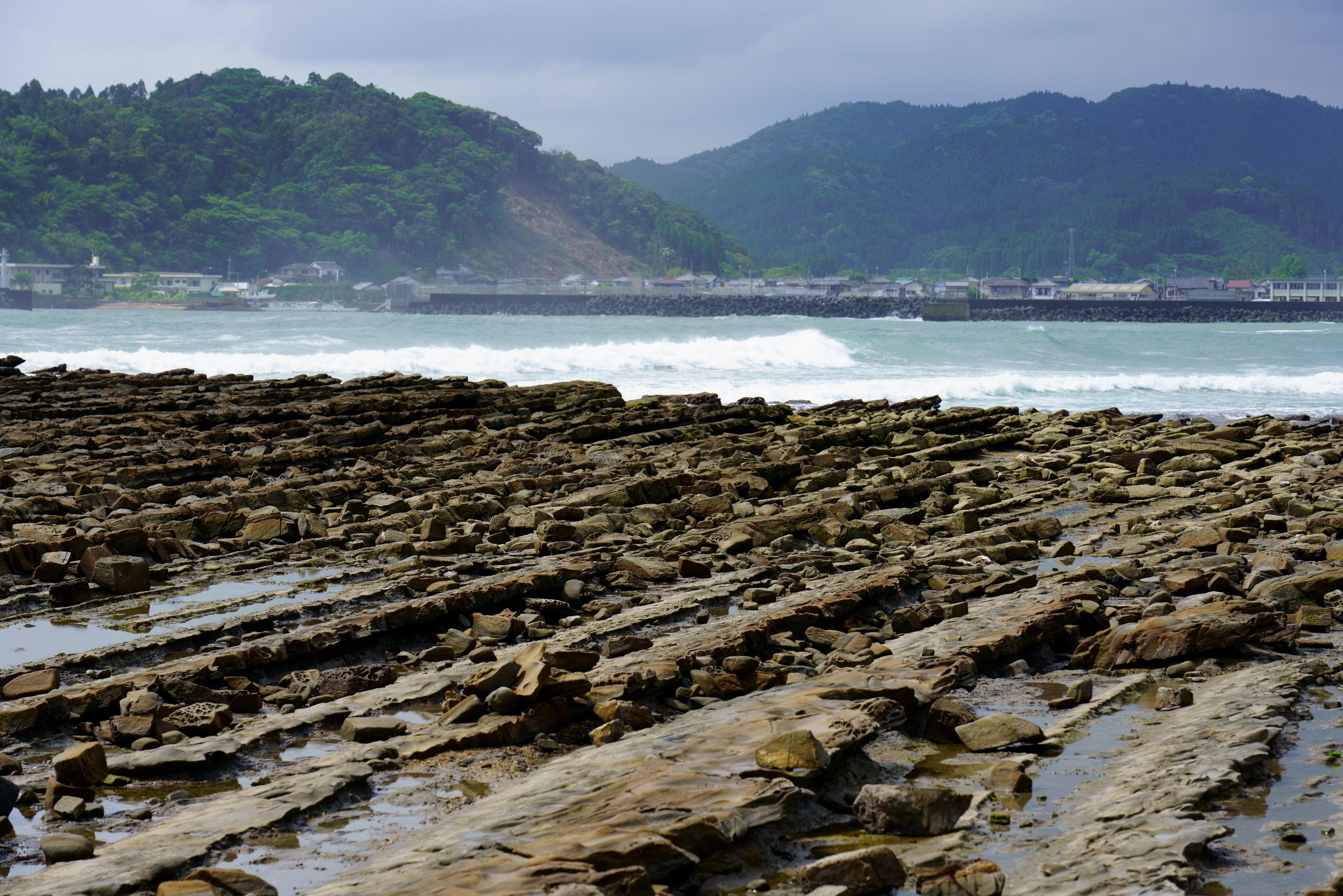 青島と日南海岸の干潮時、海岸線に波状岩で広がる「鬼の洗濯板」。 国の天然記念物に指定されています。
