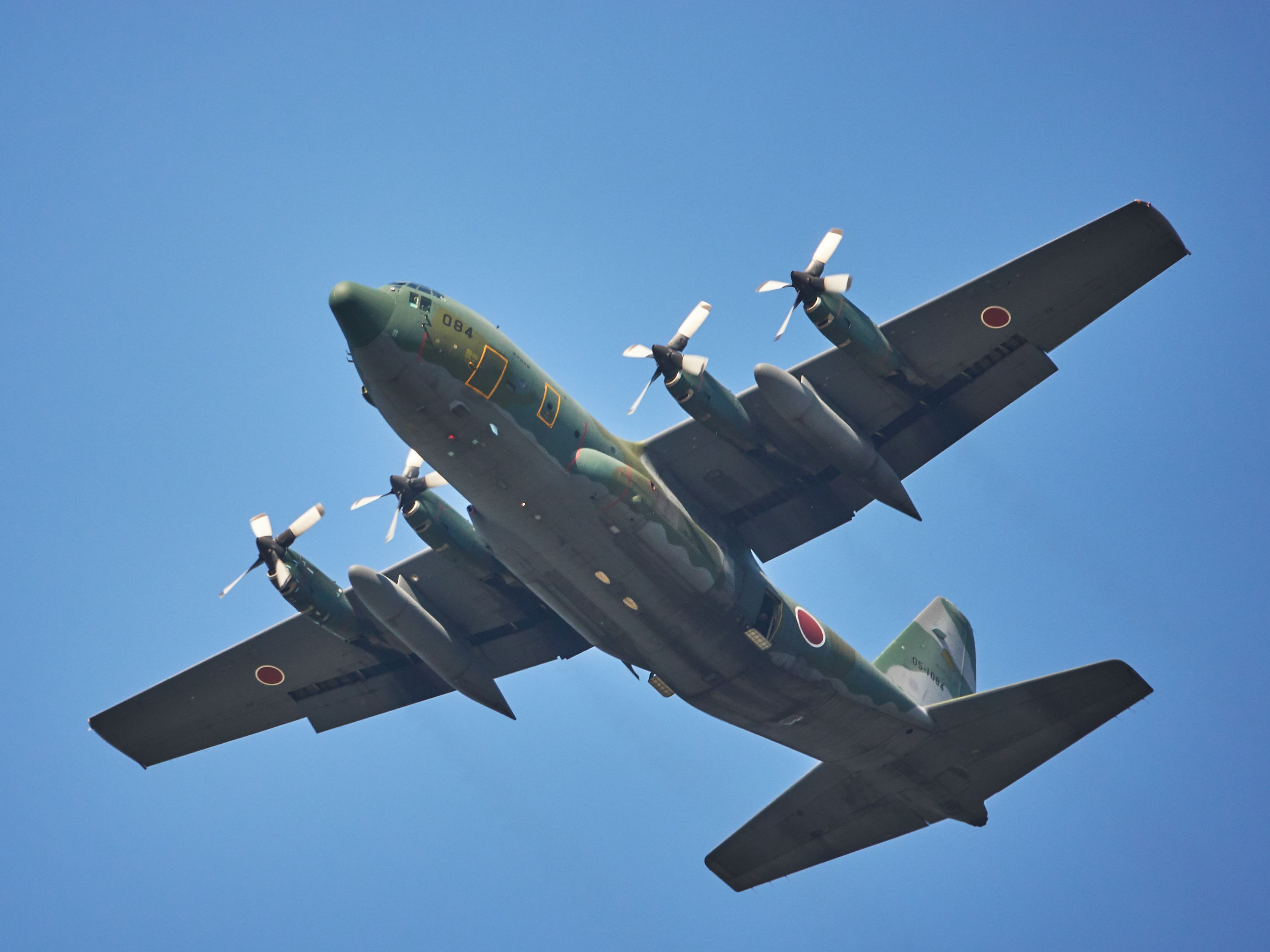 低空を飛来してきたC-130H。 ジェットと違って連写しなくても撮れました。 響く低音と太い胴体が巨大さを連想させます。 色温度、オートではかなり低めに設定されました。