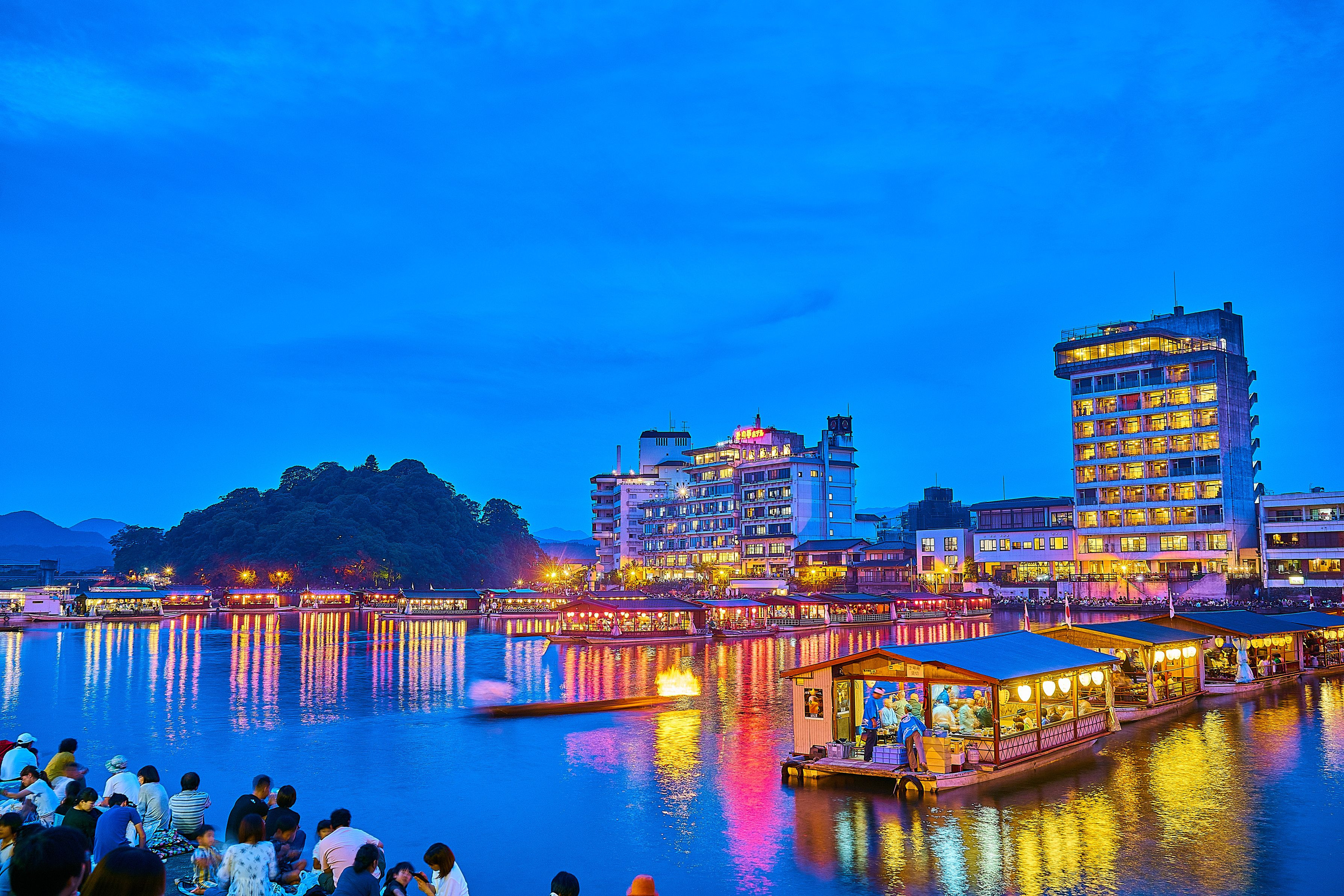 河川に浮かぶ屋形船と花火