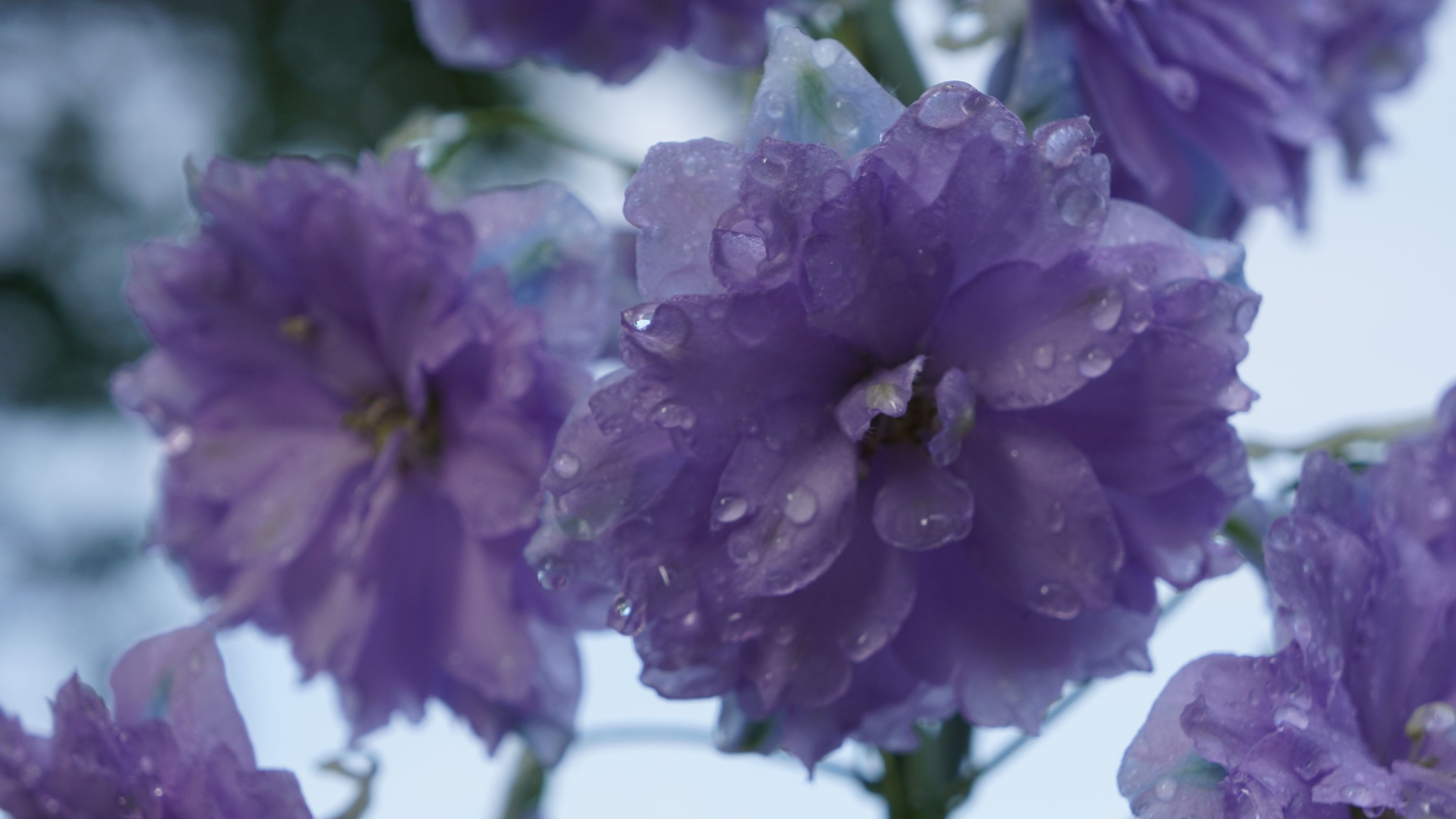 前日の雨に濡れた庭のデルフィニウム。