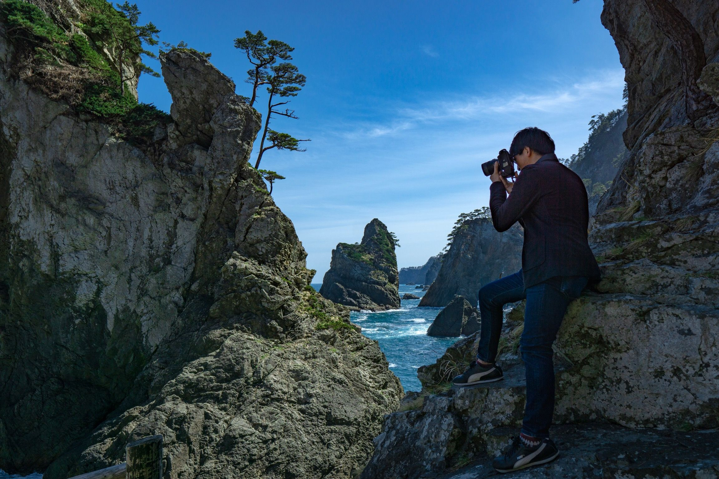 三陸ジオパークのジオサイトである北山崎にいってきました。長く険しい階段を降りると地球が生み出した荒々しい崖や岩と海がとても美しく、圧巻でした。 カメラ好きの相方さんと綺麗な景色をバックに撮ってみました。