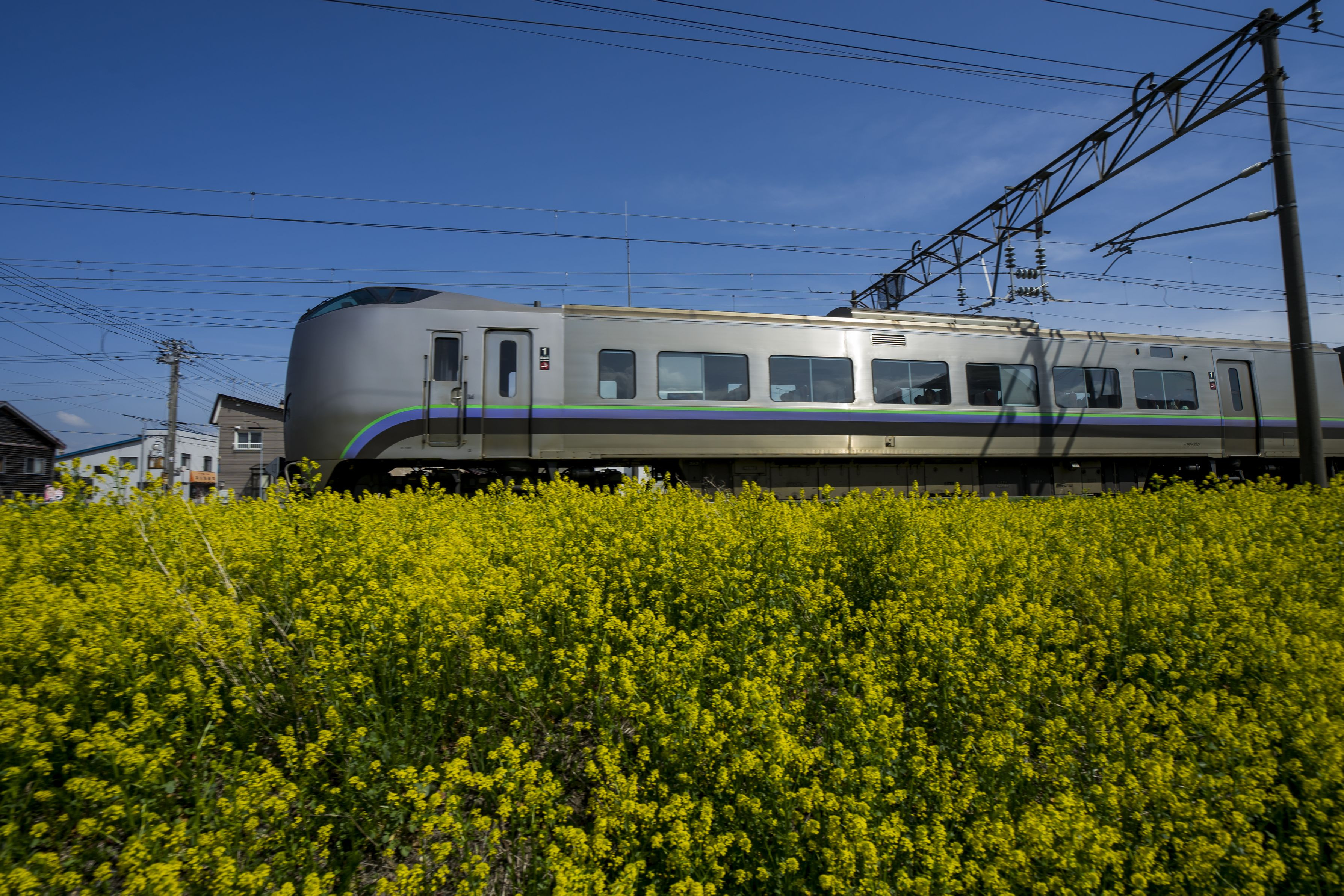 菜の花と列車の共演。 流し撮りは出来ませんでした・・・