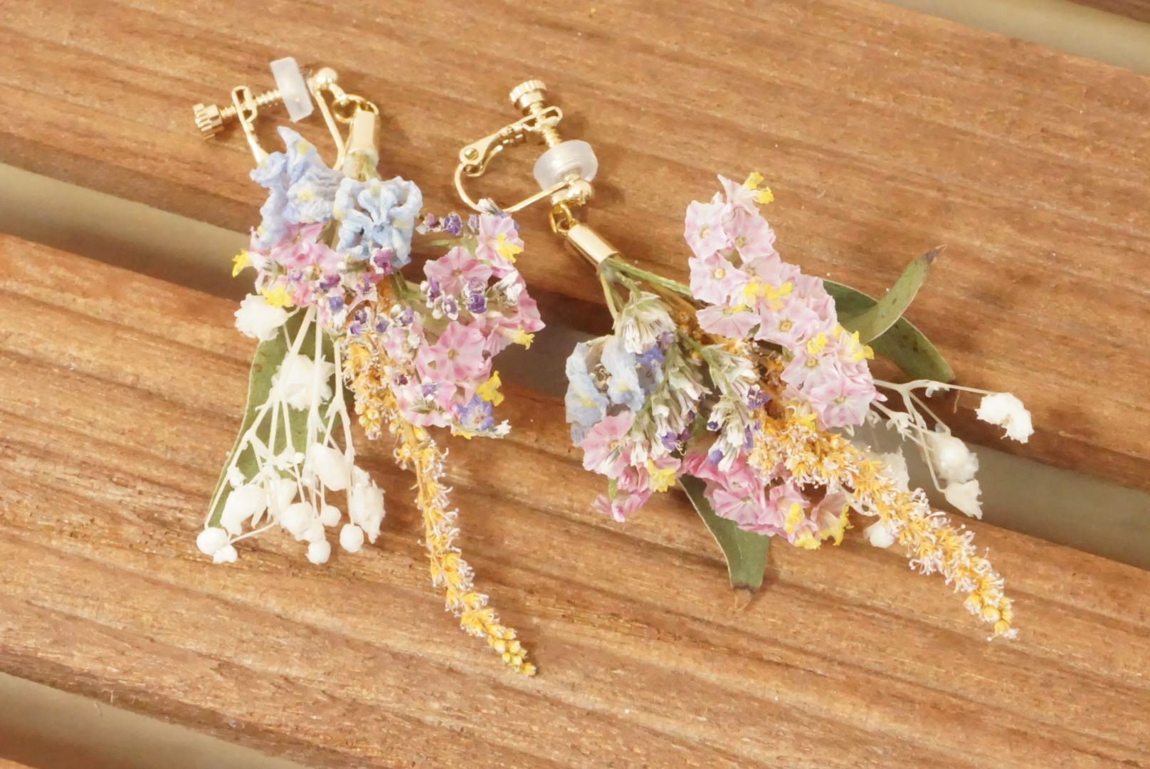 友人の結婚式で花束をいただきました。 ドライフラワーにして イヤリングを作りプレゼントしました(^^)