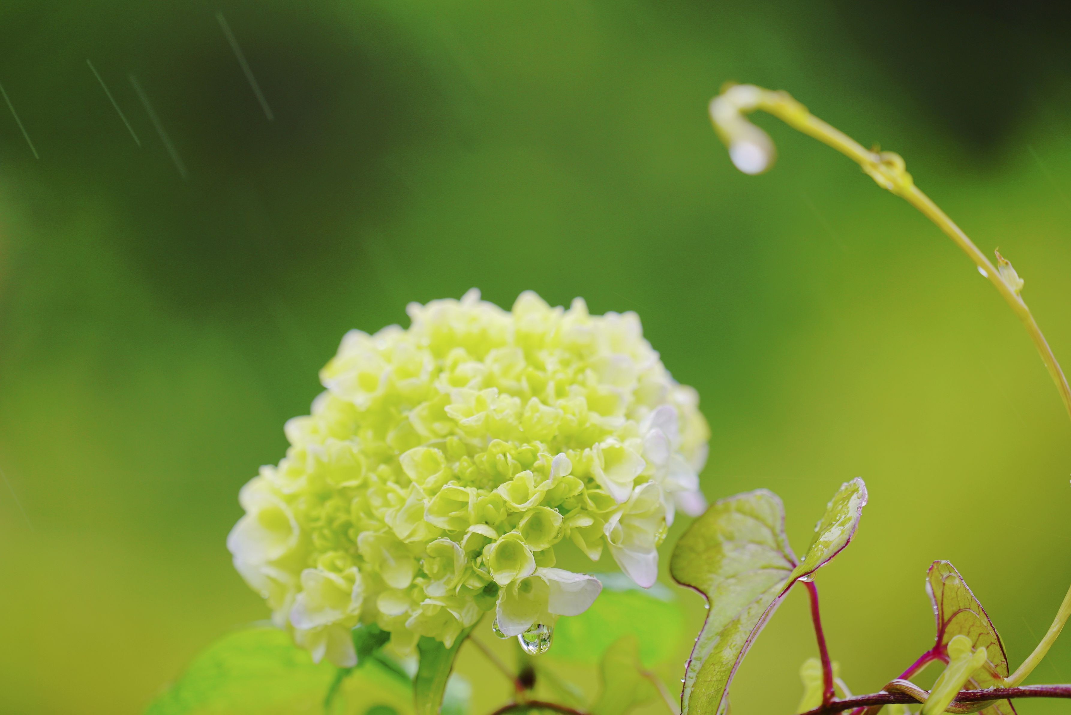 αを始めた年、「いつか雨の線とアジサイが撮れたらいいなぁ」と思ったことを覚えています。願いが叶いました。線は少しですが。